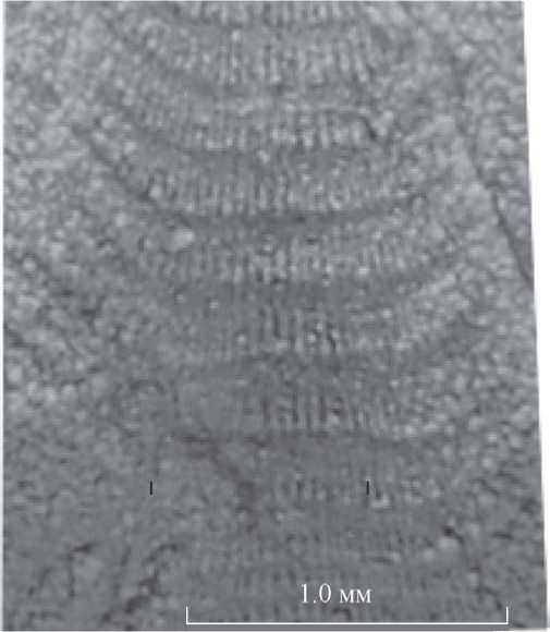 Рис. 2. Afanasjevispirifer mercuriformis (Kulkov, 1963), экз. ГМ ИГАБМ СО РАН № 6/239, микроскульптура брюшной створки; Селенняхский кряж, правобережье р. Талынджа; базальные слои пражского яруса, короткинский региоярус.