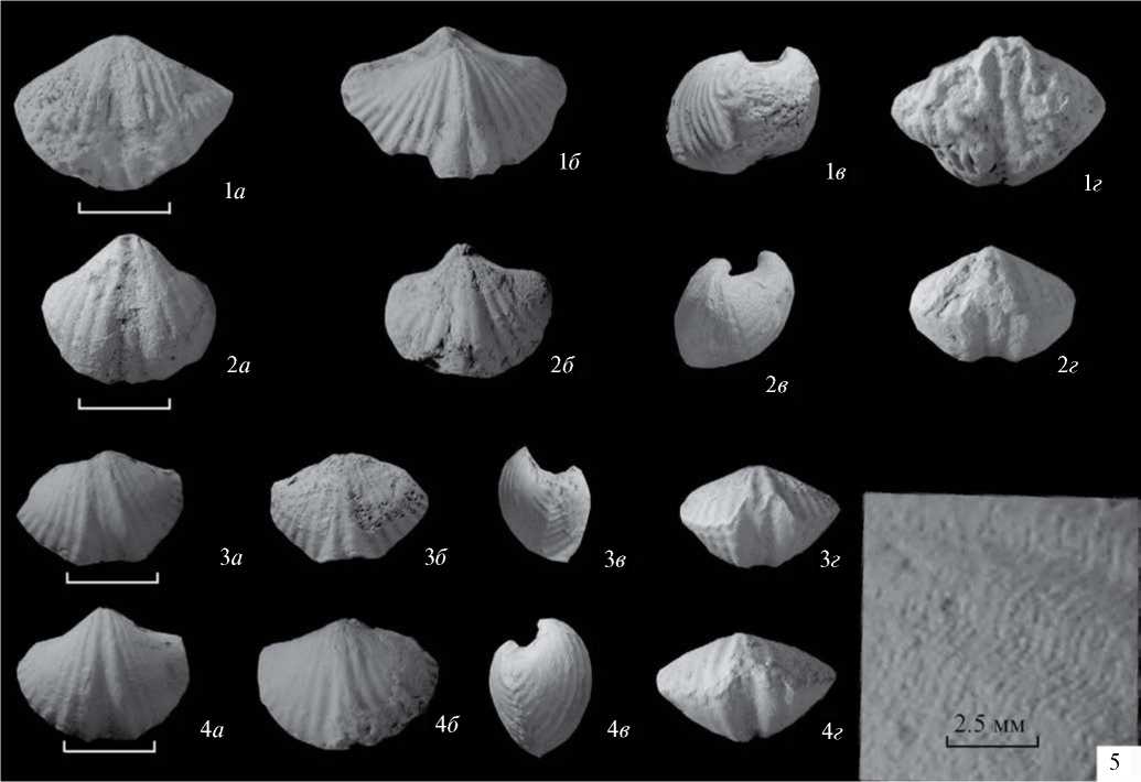 Рис. 4. Aldanispirifer selennyakhensis sp. nov. (а – брюшная створка, б – спинная створка, в – вид сбоку, г – вид спереди): 1 – голотип ГМ ИГАБМ СО РАН № 9/239, 2 – экз. ГМ ИГАБМ СО РАН № 10/239, 3 – экз. ГМ ИГАБМ СО РАН № 11/239, 4 – экз. ГМ ИГАБМ СО РАН № 12/239, 5 – экз. ГМ ИГАБМ СО РАН № 9/239, микроскульптура; Селенняхский кряж, правобережье р. Талынджа, разрез Медвежий; базальные слои пражского яруса, короткинский региоярус, обр. С–13. Линейка равна 10 мм.
