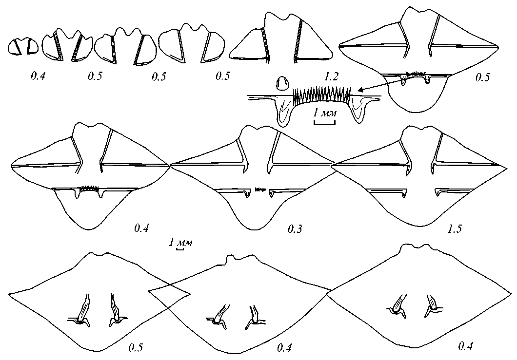 Рис. 3. Afanasjevispirifer mercuriformis (Kulkov, 1963), экз. ГМ ИГАБМ СО РАН № 8/239, последовательные поперечные пришлифовки раковины, длина оригинала 7.4 мм; Селенняхский кряж, правобережье р. Талынджа, разрез Гон; базальные слои пражского яруса, короткинский региоярус.