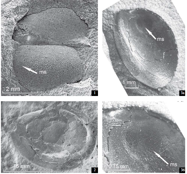 Как известно, замыкательные мускулы хорошо развиты у всех членистоногих, чьи части тела полностью или частично заключены в двустворчатый или одностворчатый панцирь. К ним относятся все остракоды, несколько групп жаброногих (Branchiopoda; например, двустворчатые листоногие – Conchostraca и ветвистоусые раки – Cladocera), усоногие рачки (Cirripedia), филлокариды (Phyllocarida) (полный обзор см.: Vannier et al., 2001). Ориентированный поперек тела мускул-аддуктор раковины сводит створки раковины вместе. Он состоит из отдельных мускульных тяжей, число которых иногда достигает нескольких сотен (Swartz, 1949; Абушик, 1960; Scott, 1961; Adachi, Igo, 1980; Рупперт, 2008; Olempska, 2008). Мускульные отпечатки обычно хорошо сохраняются на раковинах мезозойских и кайнозойских остракод, в меньшей степени – у палеозойских форм, и практически не известны на раковинах кембрийских брадориид. Морфология рубцов аддукторных мышц имеет большое таксономическое значение, как у современных, так и у ископаемых остракод (Грамм, 1984; Huo, Shu, 1985; Yamada, Keyser, 2009; Olempska, 2012). Поэтому каждая новая находка представляет большой интерес, тем более, если это касается брадориид. В некоторых работах по брадориидам упоминалось, что элементы строения раковины, выполняющие функцию их закрывания, у этих ракообразных сохранялись редко и практически недоступны для изучения (Практическое …, 1990; Siveter, 2008; Williams et al., 2015; Betts et al., 2016 и др.). Однако известно несколько публикаций, в которых имеются указания на предполагаемое наличие мускульного отпечатка у брадориид. Так, например, Е. Ульрих и Р. Басслер (Ulrich, Bassler, 1931, с. 12, 32) отмечали, что на раковинах рода Walcottella развит крупный срединный выступ, который, как они указывали: “несомненно, соответствует мускульному пятну ордовикских и силурийских лепердитиид”, но это утверждение недоказательно. У среднекембрийского вида Liangshanella burgessensis Siveter et Williams, 1997 в центральной части створок развито почти округлое пятно, состоящее из многочисленных мелких ямок. Это образование авторы интерпретировали как возможный след прикрепления мускула-аддуктора (Siveter, Williams, 1997, табл. 8 фиг. 3; Siveter, 2008). Однако М. Уильямс с соавт. (Williams et al., 2007), характеризуя в своей работе L. burgessensis, специально отметили, что, несмотря на большое количество материала, лишь на одном экземпляре сохранились рубцы аддукторного мускула. Более того, в работе С. Хоу и др. (Hou et al., 2002, с. 391) было особо подчеркнуто, что эта находка – “уникальный случай возможного присутствия отпечатка аддукторной мышцы у брадориид”. Также пока остается под вопросом возможность наличия мускула-аддуктора у некоторых видов раннекембрийских брадориид из Китая, у которых отпечатки на раковинах отстоят от субцентральной позиции очень далеко [напр., Kunmingella douvillei (Mansuy, 1912), K. typica Huo et Shu, 1985, K. xiaoyangensis Shu, 1990, K. bimargmata Tan et Li, 1988, Duibianella tuberosa Zhang, 2007; Neoduibianella bella Shu, 1990 и др.] (см. Zhang, 2007, с. 108, рис. 3). По мнению Д. Сиветера (Siveter, 2008), отпечатки, слишком близко расположенные к переднеспинному концу, не свойственны мышцам-аддукторам. Однако следует отметить, что столь высокое расположение мускула-аддуктора можно обнаружить у некоторых других ракообразных, например, у Nebalia bipes (Fabricius, 1780) из отряда тонкопанцирных (Leptostraca), но не у остракод. Неубедительным также кажется предположение о том, что большое шарообразное утолщение в центральной части раковины некоторых представителей кембрийского рода Leshanella Lee, 1975 являе