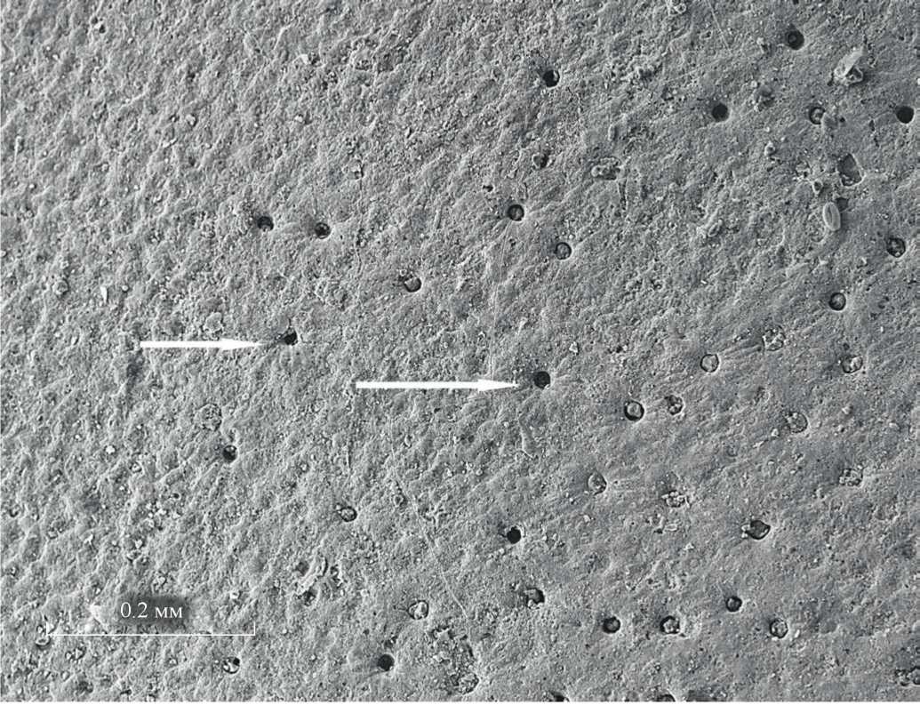 Рис. 1. Поры на поверхности створки Sinskolutella ordinata, окруженные валиком с радиально расположенными структурами (показано стрелками).