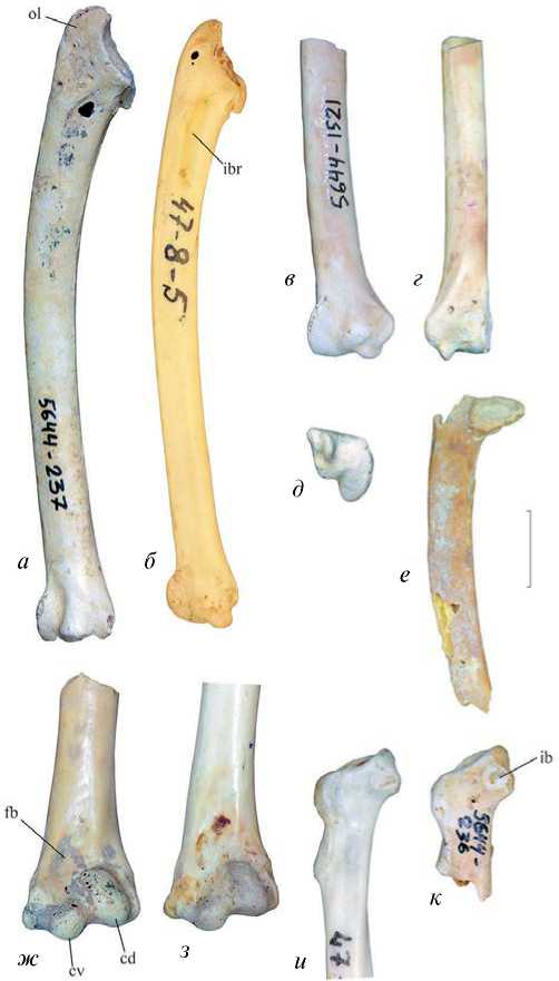 Рис. 2. Ископаемый раннеплейстоценовый тетерев Lyrurus partium Kretzoi, 1962 в сравнении с современным луговым тетеревом L. tetrix (L., 1758): а, в–ж, к – L. partium; Крым, пещера Таврида; нижний плейстоцен: а – экз. ПИН, № 5644/237, левая локтевая кость; в–д – экз. ПИН, № 5644/1521, дистальный фрагмент левой локтевой кости; е – экз. ПИН, № 5644/1507, неполная правая лопатка; ж – экз. ПИН, № 5644/1508, дистальный фрагмент левой плечевой кости; к – экз. ПИН, № 5644/236, краниальный фрагмент правого коракоида; б, з, и – L. tetrix, экз. остеол. коллекции ПИН, № 47-8-5, самец, современный. а–в, и, к – с вентральной стороны; г – с дорсальной стороны; д – с дистальной стороны; е – с латеральной стороны; ж, з – с краниальной стороны. Обозначения: cd – condylus dorsalis; cv – condylus ventralis; fb – fossa m. brachialis; ib – impressio bicipitalis; ibr – impressio brachialis; ol – olecranon. Длина масштабной линейки 10 мм.