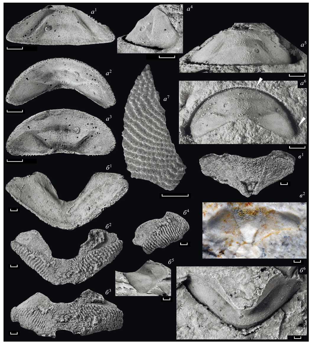 Рис. 2. Ochmazochiton uralensis sp. nov.: а – головной щиток, паратип ПИН, № 5538/10-1534, ×9 (кроме фиг. а7): a1–a3 – латексный слепок вентральной поверхности: a1 – вид сзади, a2 – вид снизу, a3 – наклонный вид; а4–а6 – отпечаток вентральной поверхности: а4 – вид слева, а5 – вид спереди, а6 – вид сверху; а7 – латексный слепок фрагмента тегментума, хорошо различимы крупные поры на гранулах [передний и левый край (вверх изображения), положение фрагмента на отпечатке показано стрелками на фиг. а6], ×15; б – паратип ПИН, № 5538/10-507, промежуточный щиток, ×4: б1 – латексный слепок вентральной поверхности, вид снизу; б2–б4 – латексный слепок дорсальной поверхности: б2 – вид сверху, б3 – вид сзади, б4 – вид слева; б5, б6 – отпечаток вентральной поверхности: вид слева, вид сверху; в – паратип ПИН, № 5538/10-508, промежуточный щиток, ×4: в1 – латексный слепок продольного скола биоморфозы кальцита по тегментуму, наблюдаются также отпечатки оснований апофизов; в2 – продольный скол биоморфозы кальцита по тегментуму в югальной и плевро-латеральных областях, а также отпечатки оснований апофизов; Башкортостан, карьер Шахтау, местонахождение № 5538/10; сакмарский ярус. Шкала – 1 мм.