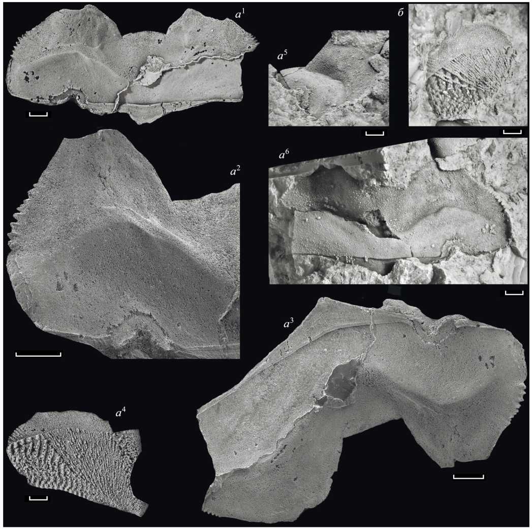 Рис. 3. Ochmazochiton uralensis sp. nov., промежуточные щитки одного животного: а – паратип ПИН, № 5538/10-1581: а1–а4 – латексный слепок: а1 – вентральная поверхность, ×6; а2 – правая часть вентральной поверхности, в том числе инсерционная пластина, ×15; а3 – вентральная поверхность, наклонный вид сзади, в правой части заднего края прижизненное повреждение, ×10; а4 – дорсальная поверхность: инсерционная пластина и фрагмент апофиза, латеральная область с тонкими элементами скульптуры, плевро-латеральная область – отпечаток биоморфозы кальцита по тегментуму, ×6; а5, а6 – отпечаток вентральной поверхности: вид справа и сверху, ×6; б – паратип ПИН, № 5538/10-1580, отпечаток дорсальной поверхности: инсерционная пластина и апофиз, отпечаток латеральной области, в плевральной области биоморфоза кальцита по тегментуму (избирательное замещение), ×6; Башкортостан, карьер Шахтау, местонахождение № 5538/10; сакмарский ярус. Шкала – 1 мм.