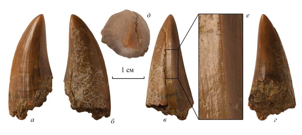 Рис. 2. Зубная коронка Mosasaurus sp., экз. ОШММ № 148: а – лингвальный вид, б – буккальный вид, в – вид спереди, г – вид сзади, д – вид с апикальной стороны, е – увеличенный фрагмент, показывающий зубчики на карине; Россия, Оренбургская обл., Ижбердинский карьер; верхний мел, нижний кампан.