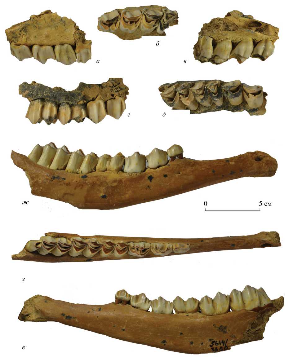 Рис. 2. Eucladoceros orientalis (Radulesco et Samson, 1967); а–в – экз. ПИН, № 5644/3359, фрагмент левой верхнечелюстной кости с P2–Р4 и частью M1; г, д – экз. ПИН, № 5644/3360, фрагмент правой верхнечелюстной кости с P3–M2; ж–е – экз. ПИН, № 5644/3358, неполная правая ветвь нижнечелюстной кости с P2–M3.; а, г, ж – с буккальной, б, д, з – с окклюзиальной, в, е – с лингвальной сторон; Крым, пещера Таврида; нижний плейстоцен.
