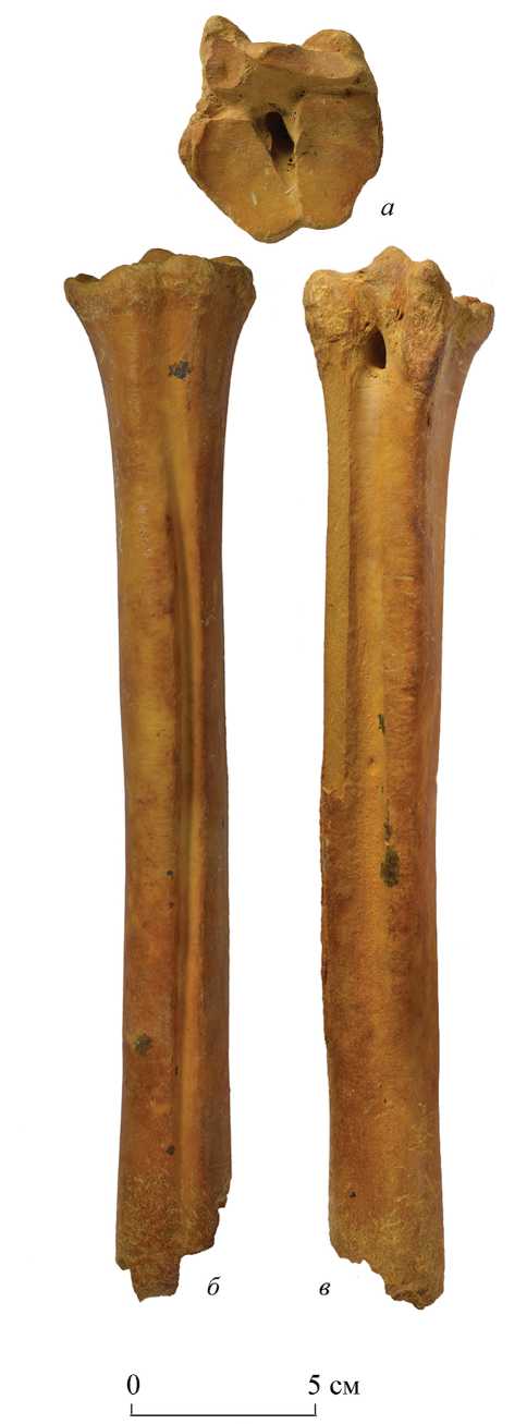 Рис. 3. Eucladoceros orientalis (Radulesco et Samson, 1967), экз. ПИН, № 5644/3363, левая плюсневая кость без дистального конца, а – сверху, б – спереди, в – сзади; Крым, пещера Таврида; нижний плейстоцен.