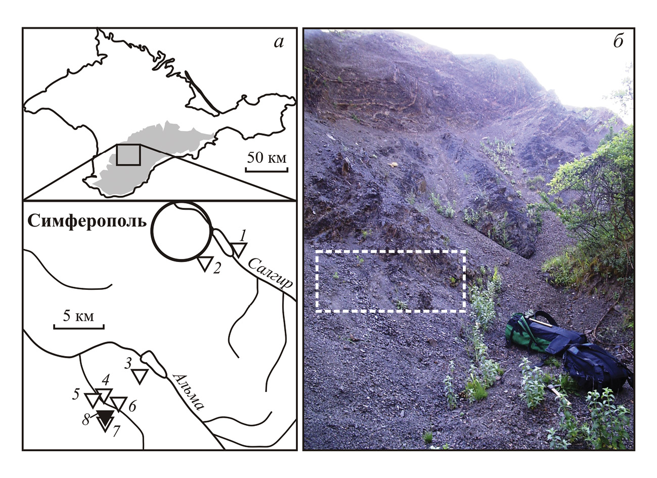 Рис. 1. Места находок обсуждаемых в статье белемнитов – (а), фотография разреза глинистого флиша верхнетаврической (яманской) свиты в овраге Яман с отмеченным участком, в осыпи которого обнаружен описываемый ростр (б): 1 – карьер Лозовое на правобережье р. Салгир в окрестностях г. Симферополь; 2 – Греческий (старый Курцовский) карьер на южной окраине г. Симферополь; 3 – балка Волковская на левом берегу р. Альма; 4 – Аммонитовый овраг в районе с. Трудолюбовка; 5 – северный склон горы Патиль (Татьянина горка) в районе с. Трудолюбовка; 6 – северный склон горы Большой Кермен; 7 – юго-западный и юго-восточный склоны горы Шелудивая в районе с. Прохладное; 8 – овраг Яман в окрестностях с. Прохладное. Территория Горного Крыма окрашена серым цветом.