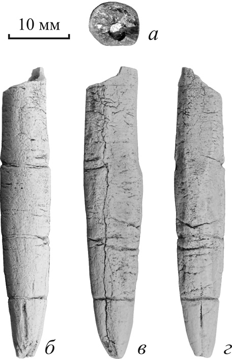 Описание (рис. 2). Ростр небольшого размера, вытянутый, цилиндро-конической спереди формы с субверетеновидным, несколько асимметричным профилем и умеренно удлиненной привершинной частью (рис. 2, а–г). Привершинные спинно-боковые и брюшная борозды хорошо выраженные, они немного углублены за счет выщелачивания. Поперечное сечение имеет округленно-субчетырехугольную форму, сжато в спинно-брюшном направлении на всем протяжении ростра. Вершина альвеолы заметно смещена к брюшной стороне.