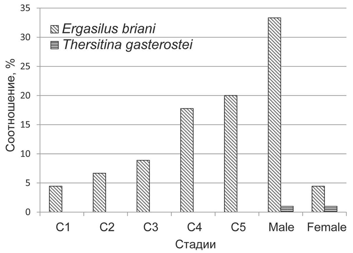 Массовое развитие E. briani в данном месте могло быть обусловлено и специфическими гидрологическими характеристиками части водоема, в котором производились сборы, – слабоотшнурованной старицей, основательно заросшей растительностью. Карповые рыбы – более теплолюбивые и нуждающиеся в постоянном питании в отличие от заходящих в реку лососевых рыб, способных к длительной голодовке. Поэтому карповые, по-видимому, накапливаются в той части водоема, где эти требования выполняются в большей мере. Замедленный характер течения, значительное зарастание старицы макрофитами приводят к разогреву ее солнечными лучами, что вероятно привлекает сюда карповых рыб, а также способствует размножению теплолюбивого E. briani (Tuuha et al., 1992; Евдокимова и др., 2010). С другой стороны, эти же условия способствуют возможности перехода паразитических копепод на будущих хозяев. Кроме того, массовый заход крупных лососевых рыб из моря сопровождается прессом на мелких представителей ихтиофауны, в т.ч. карповых, поскольку в начале миграционного периода лососевые продолжают питаться. Таким образом, по нашему мнению, карповые рыбы в период массового хода лососевых, вероятно, собираются в неких рефьюгиях, которым и является сильно заросший старичный участок. На высокую эффективность в поиске паразитами своих хозяев в этих условиях, наряду с собственно высокой численностью популяции, указывает также половая структура взрослых особей, где численность самок составляла около 12%. Существенно, что среди неполовозрелых стадий соотношение полов было примерно одинаково. Это исключает предположение о том, что большее количество самцов определяется их более ранним созреванием. Таким образом, можно предположить, что основная часть половозрелых самок этой генерации на момент сбора проб уже успешно нашла своих хозяев. Численность свободноживущих стадий второго вида – Thersitina gasterostei – была значительно меньше, что препятствует анализу возрастной структуры популяции этого вида . Однако обнаруженное соотношение полов 1 : 1, возможно, свидетельствует о менее благоприятных условиях для этого вида или о том, что сбор наших проб не был приурочен к пику численности его популяции. Для решения правомочности первого либо второго предположения было бы желательно получить данные по экстенсивности и интенсивности заражения рыб, однако эти сведения были нам недоступны.