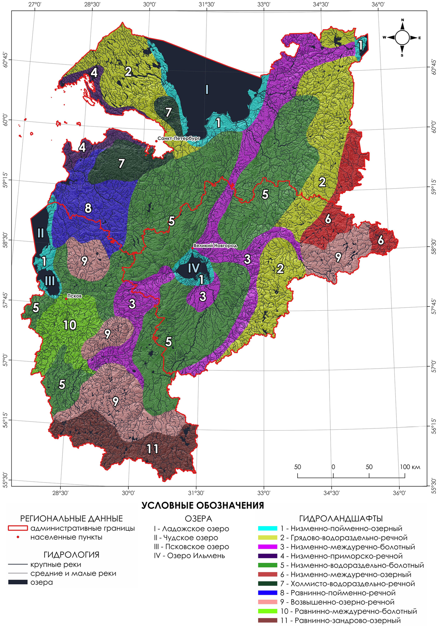Рисунок 1. Карта-схема гидроландшафтного районирования территории Ленинградской, Псковской и Новгородской областей.