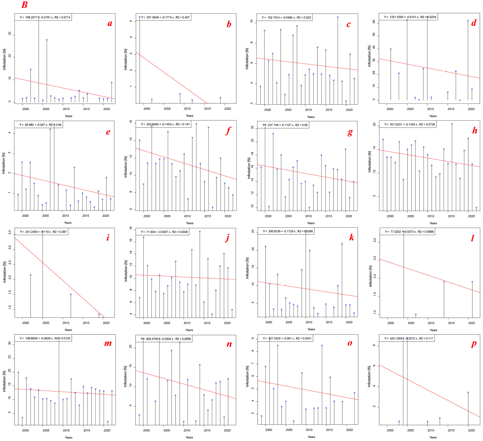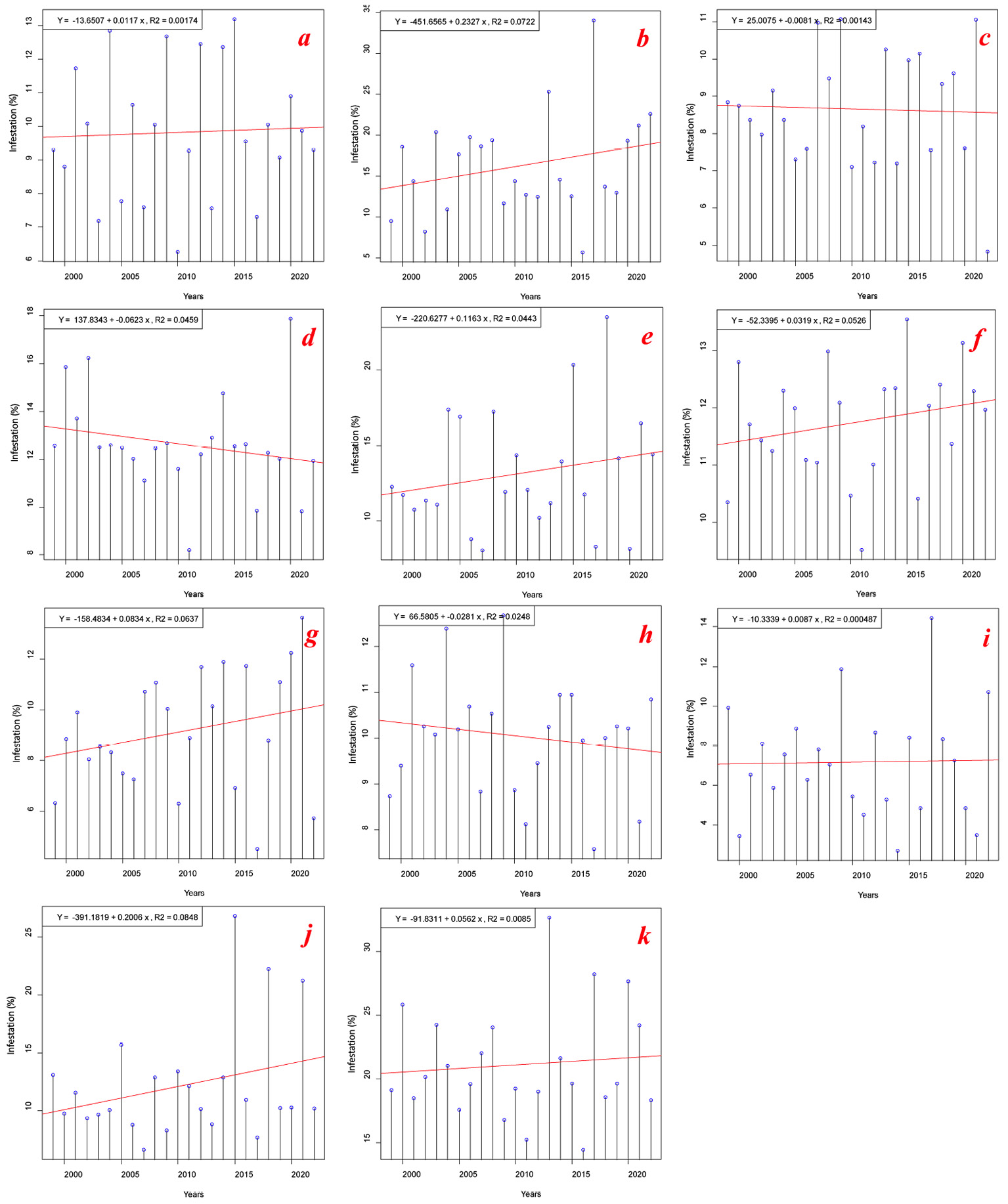 Pediculosis caused by the Pediculus capitis (De Geer, 1767), is a major public health concern worldwide, including in Iran. Policymakers must be well-informed on the relevant evidence through comprehensive studies. No study has been done concerning trends of Pediculus capitis infestation in provinces of Iran, geographic and climatic regions, seasons, location of meridians and tropics areas, together with the distribution and stratification. Therefore, a study of the mentioned objectives was conducted. The data on P. capitis infestation levels and factor impacts on P. capitis infestation levels in Iranian people were extracted and summarized from 126 articles. The trends of P. capitis infestation have increased in about half of the country’s provinces over the previous two decades. These provinces are located mostly in the southern Caspian Sea shores, the central plateau, and the south coast. Pediculus capitis infestations are in the range of -ꝏ–-0.40, -0.40–-0.20, and -0.20–0.00 in the regression coefficient regarding the distribution and stratification. For the first time in this study, the impact of the meridians and the tropics that pass through Iran was also evaluated on P. capitis infestation. Based on the intensity of P. capitis infestation, the order of the influence of the factors that affect infestation is estimated. Interaction modeling demonstrated that primary school has a synergistic impact on time trends. In addition, the Western mountains, the central plateau, and the southeast showed synergistic effects with time trends on the incidence of the outcome. The findings provide the national baseline data to initiate steps for national pediculosis intervention programs.
