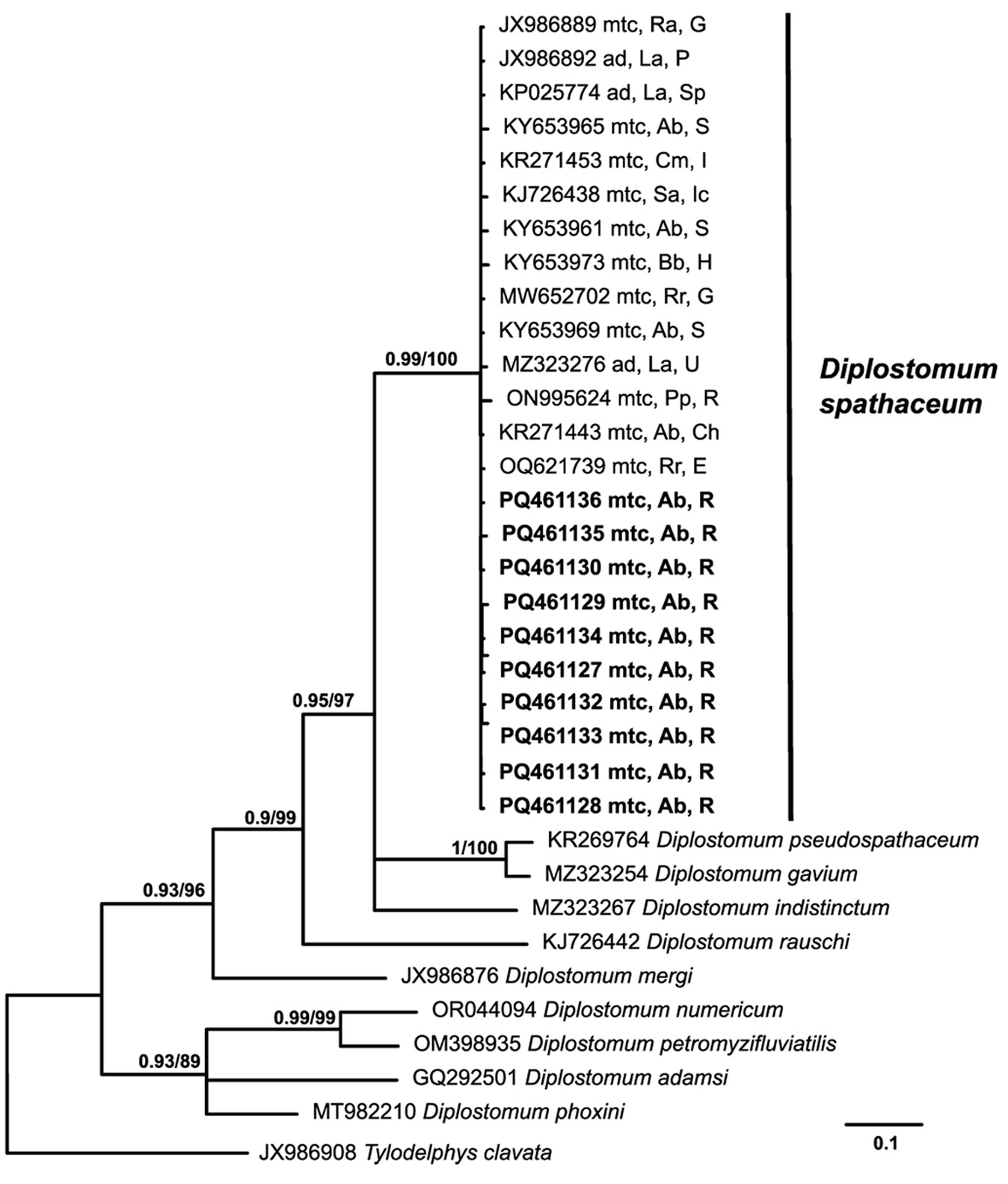 The cox1 sequence JX986909 of Tylodelphys clavata (Nordmann, 1832) was used as an outgroup.