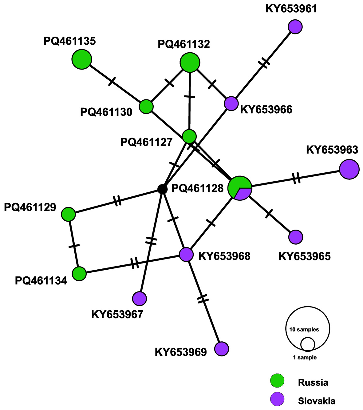Figure 3. Haplotype network for Diplostomum spathaceum based on novel and published partial cox1 mtDNA sequences of Kudlai et al. (2017). Unsampled intermediate haplotype is represented by a short intersecting line; each branch corresponds to a single mutational difference and connective lines represent one mutational step. Circle size is proportional to the number of isolates sharing a haplotype; black circles indicate transitive haplotypes that have not been found.