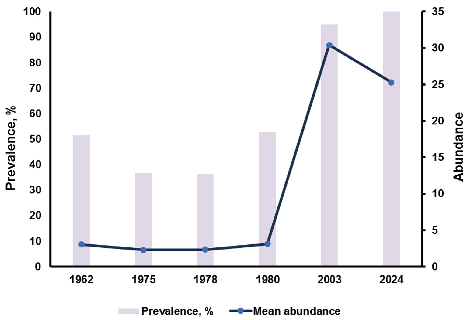 The joint analysis of our own and published data shows that the rates of Diplostomum metacercariae infection in bream of Lake Syamozero have have increased significantly since 1980 (Fig. 6).