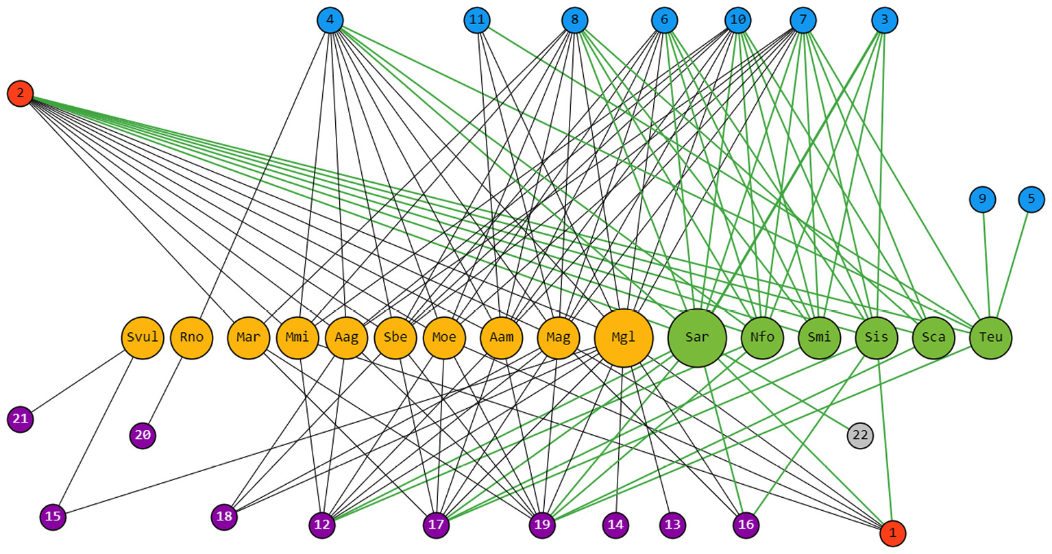 Хозяева – грызуны (желтые кружки) и насекомоядные (зеленые): Sar – Sorex araneus L., 1758, Smi – S. minutus L., 1766, Sca – S. caecutiens Laxmann, 1788, Sis – S. isodon Turov, 1924, Nfo – Neomys fodiens (Pennant, 1771), Teu – Talpa europaea L., 1758, Svul – Sciurus vulgaris L., 1758, Mgl – Myodes glareolus (Schreber, 1780), Moe – Alexandromys oeconomus (Pallas, 1776), Aam – Arvicola amphibious (L., 1758), Mag – Microtus agrestis (L., 1761), Mar – Microtus arvalis (Pallas, 1778), Mmi – Micromys minutus (Pallas, 1771), Aag – Apodemus agrarius (Pallas, 1771), Rno – Rattus norvegicus (Berkenhout, 1769), Sbe – Sicista betulina (Pallas, 1779). Блохи – сем. Leptopsyllidae (красный цвет): 1 – Peromyscopsylla bidentata, 2 – P. silvatica; сем. Hystrichopsyllidae (синий): 3 – Corrodopsylla birulai, 4 – Ctenophthalmus agyrtes, 5 – C. bisoctodentatus, 6 – C. uncinatus, 7 – Doratopsylla dasycnema, 8 – Hystrichopsylla talpae, 9 – Palaeopsylla kohauti, 10 – Palaeopsylla soricis, 11 – Rhadinopsylla integella; сем. Ceratophyllidae (фиолетовый): 12 – Amalaraeus penicilliger, 13 – Ceratophyllus garei, 14 – C. indages, 15 – C. sciurorum, 16 – Megabothris calcarifer, 17 – M. rectangulatus, 18 – M. turbidus, 19 – M. walkeri, 20 – Nosopsyllus fasciatus, 21 – Tarsopsylla octodecimdentata; сем. Pulicidae (серый): 22 – Ctenocephalides felis.