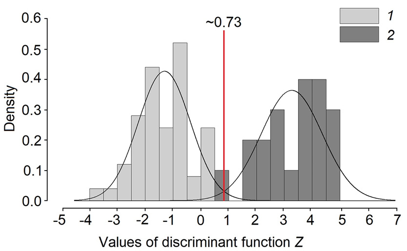 Figure 2. Distribution of the discriminant function Z values for G. teuchis from water bodies in the Baltic (1) and White (2) Sea drainage basins. Deviation from normality is insignificant (Shapiro–Wilk test: W < 0.939, p > 0.225). Red line marks the threshold value (correct prediction probability P ~ 96.4%, see also text).