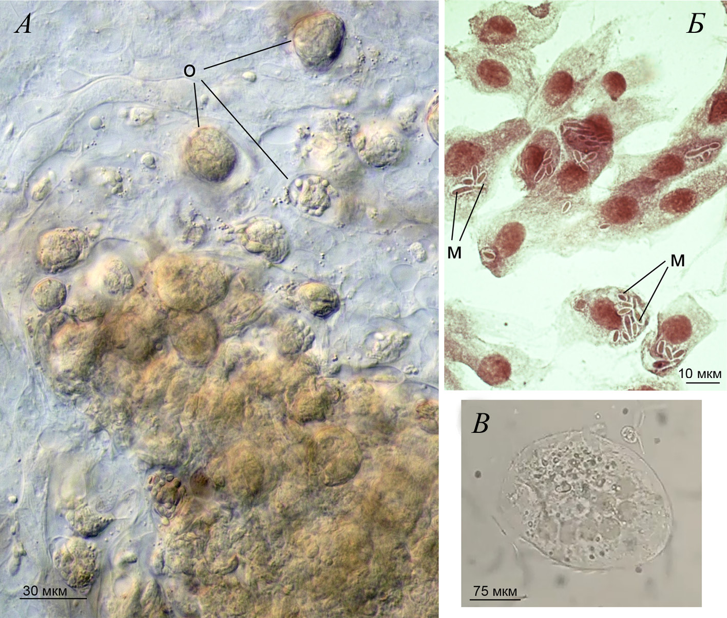 Рисунок 4. Протисты, паразитирующие в Succinea putris (А–Б): А – ооцисты кокцидий Klossia sp. на разной стадии развития. Б – мерозоиты Klossia sp. внутри клеток почки; В – инфузория подтипа Intramacronucleata. м – мерозоиты, о – ооцисты со споробластами и спороцистами.