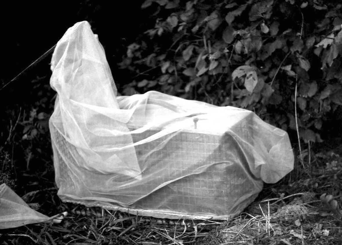 Рисунок 4. Установка ловушки. Садок с кроликом закрыт чехлом из мелкоячеистой сетки с открытой боковой вершей, второе дно верши вынуто с собранными имаго (внизу слева). Фото Е.В. Панюковой.