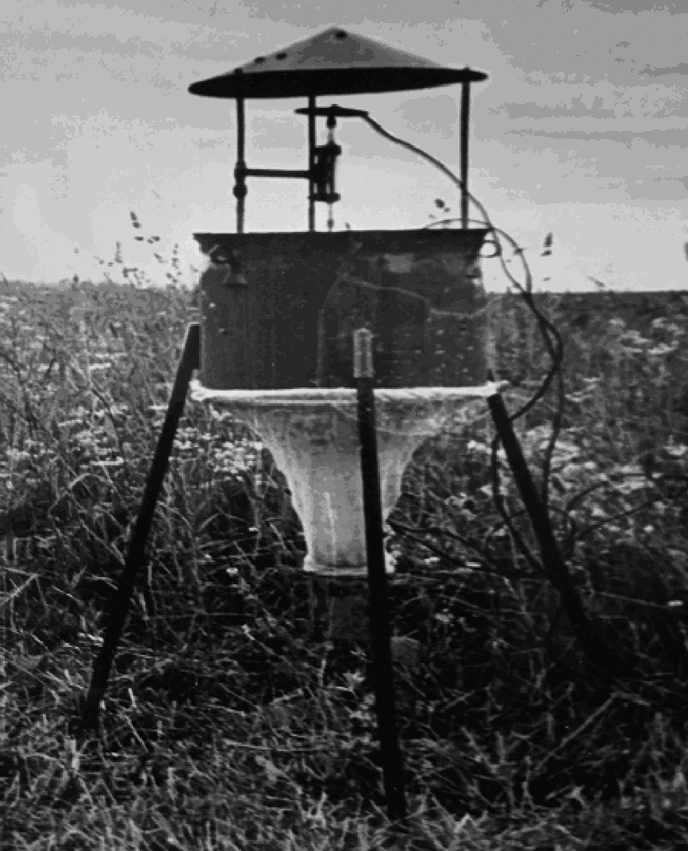 Позднее был предложен вариант колокола, изготовленного из темной материи, – колокол Березанцева (рис. 2). В куполе колокола имеется отверстие, куда вставляется небольшой садок из светлой ткани. При опущенном колоколе насекомые устремляются к свету и собираются в садке. Садки с собранными насекомыми заменяют при наполнении на пустые садки (Березанцев, 1959).