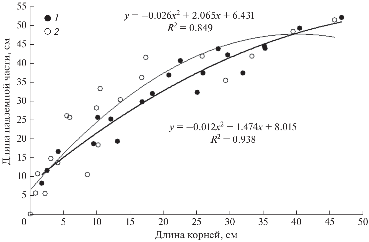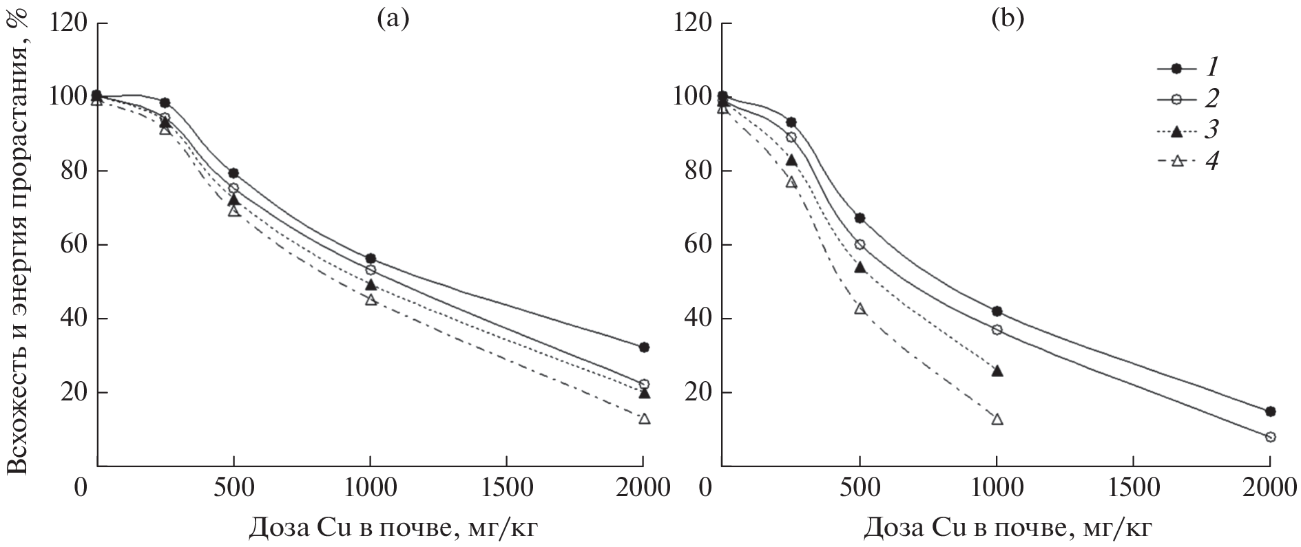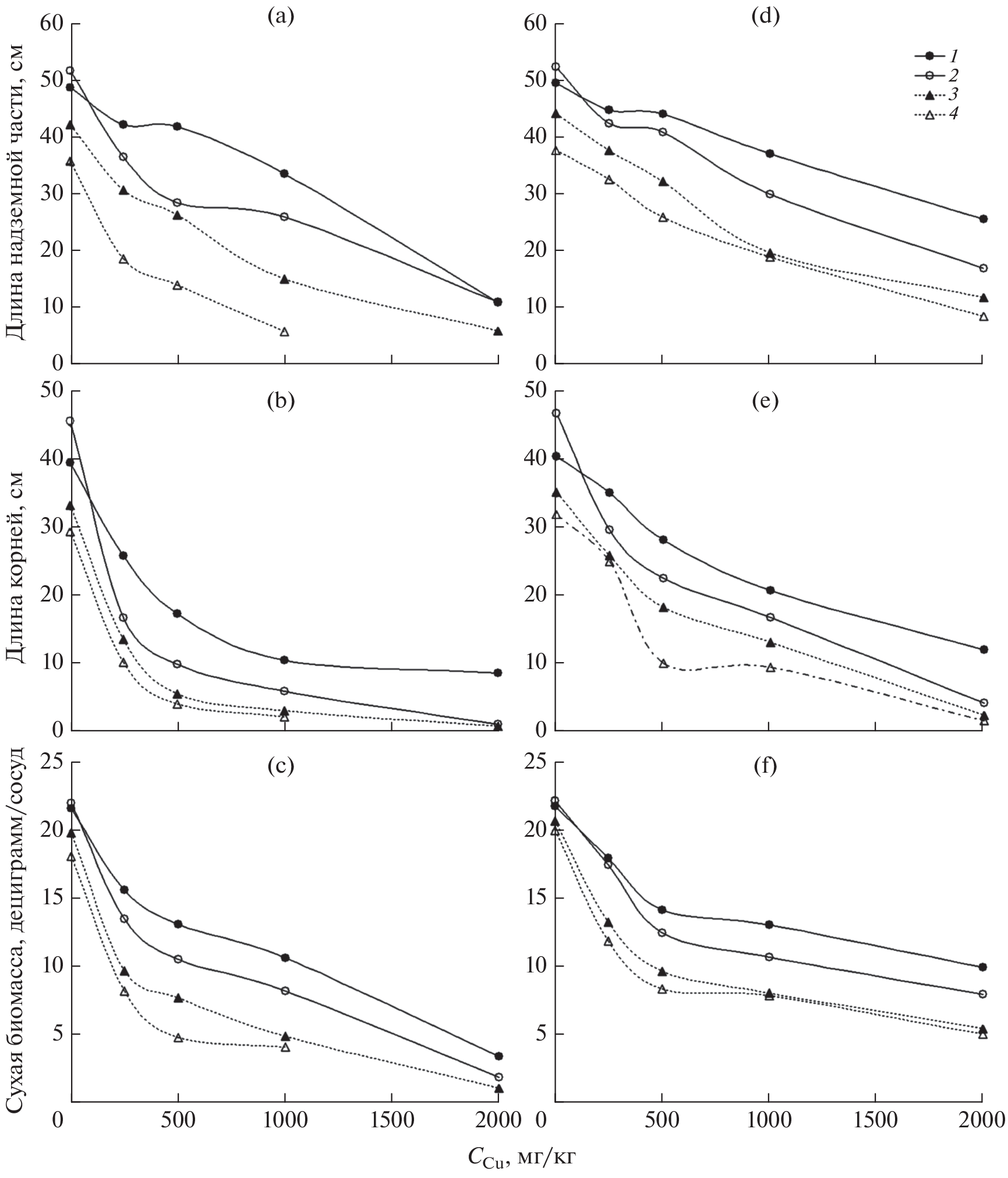 In a multifactorial vegetation experiment, the effect of the composition and properties of soils and soil-sandy substrates contaminated with various doses of copper acetate on the morphometric parameters of spring barley seedlings was studied. It has been shown that the germination and vigor of seed germination, as well as the length of roots, aboveground parts, and dry biomass of plants depend in a complex way on the concentration of Cu in soils and substrates, as well as their buffering capacity to heavy metals. The presence of two mechanisms of Cu influence on plant development was established: metabolic at СCu < 500 mg/kg of soil and diffusion at СCu > 500 mg/kg. Using methods of regression analysis on experimental data, a multiple regression equation was obtained that combines morphometric parameters of plants, concentration of Cu in the substrates, and the buffering capacity of soils to heavy metals. On its basis, in the coordinates of soil buffering capacity – Cu concentration, a curve of values f the maximum permissible concentration of Cu in soils in the concentration range from 17 to 2047 mg/kg. It makes the possibility to separate the zone of permissible development of barley plants (reduction of morphometric parameters by no more than 15%) from the zone of exceeding the accepted value of maximum permissible concentration of Cu. Thus, maximum permissible concentration of Cu is considered not as a fixed value, but as a function of Cu concentration, soil buffering capacity, and plant species.