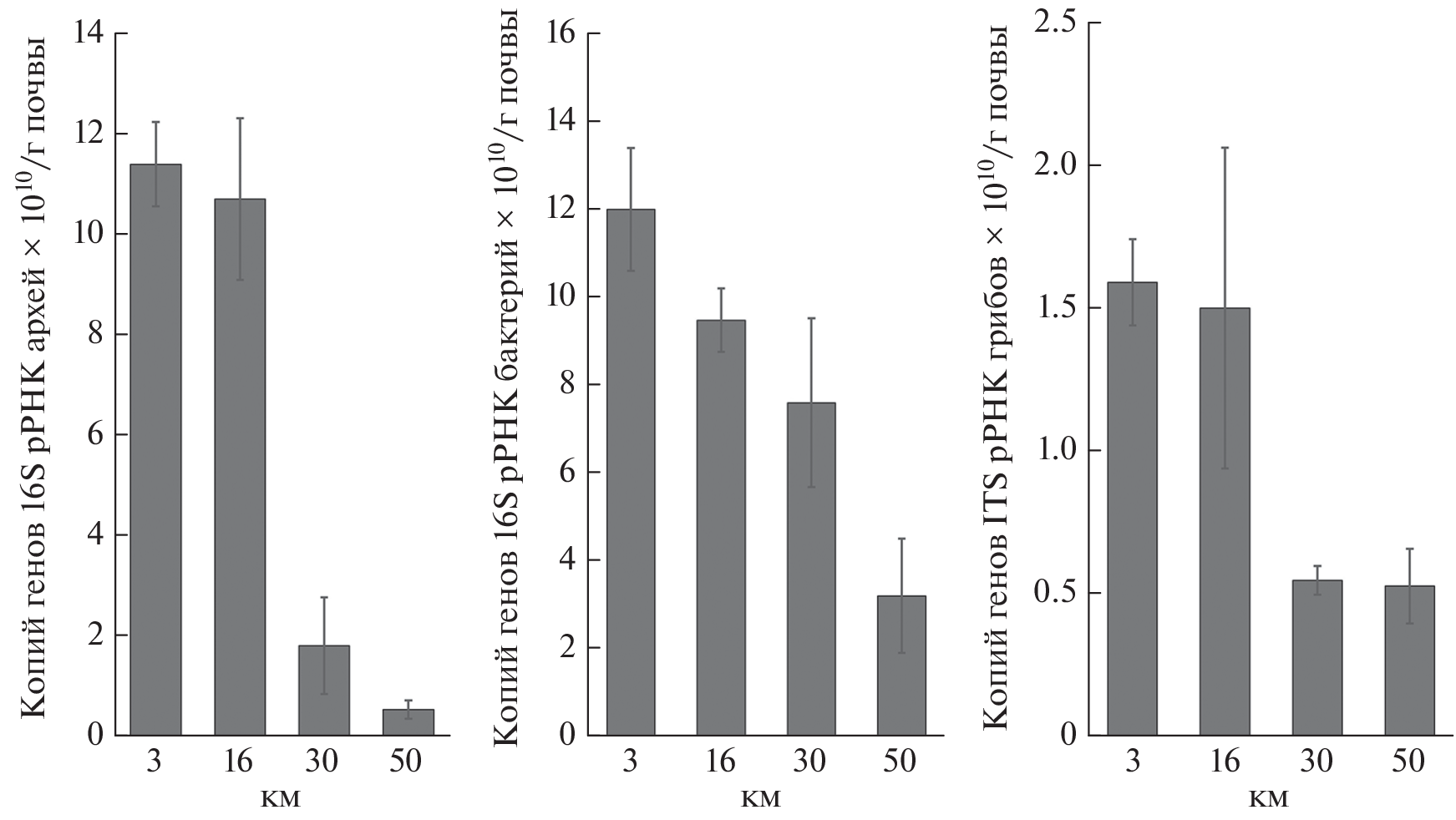 Проанализированы параметры микробиома Al–Fe-гумусовых подзолов на песчаной морене (Albic Podzols) по градиенту загрязнения соединениями меди, никеля и другими металлами на различном расстоянии (3, 16, 30, 50 км) от горно-металлургического комбината “Печенганикель” (Мурманская область). Проведена оценка запасов и структуры биомассы прокариот и грибов методом люминесцентной микроскопии; определено содержание копий рибосомальных генов микроорганизмов методом полимеразной цепной реакции в реальном времени; изучено таксономическое разнообразие и численность культивируемых почвенных микромицетов. Выявлено увеличение количества копий рибосомальных генов бактерий, архей и грибов вблизи источника выбросов по сравнению с удаленными участками. На всех участках наибольшее количество копий генов отмечено для бактерий от 3.21 × 1010 до 12 × 1010 копий генов/г почвы. Для грибов и архей их количество изменялось в пределах от 0.53 × 1010 до 1.59 × 1010 и от 0.55 × 1010 до 11.41 × 1010 копий генов/г почвы соответственно. Минимум рибосомальных генов всех групп микроорганизмов: археи, бактерии и грибы – выявлен в 50 км от комбината, а максимум – в 3–16 км от источника выбросов. Численность прокариот изменялась от 1.04 × 108 до 8.6 × 108 кл./г почвы, а биомасса – от 0.2 до 18.3 мкг/г почвы. Биомасса грибов варьировала от 122 до 572 мкг/г почвы. Отмечено существенное снижение биомассы всех групп микроорганизмов вблизи завода. Мицелий и споры грибов на всех участках преимущественно представлены мелкими формами диаметром 2–3 мкм. Длина грибного мицелия изменялась от 51.2 м/г вблизи комбината до 397 м/г на удаленных участках, при этом закономерностей в его распределении по градиенту загрязнения не выявлено. Отмечено сокращение разнообразия культивируемых почвенных микромицетов на уровне родов и вышестоящих таксонов по градиенту загрязнения выбросами завода. Выявлена смена структуры сообществ с полидоминантной (фоновый участок) на монодоминантную (вблизи завода). Вид Penicillium raistrickii доминировал на всех участках. В зоне 16 км от источника выбросов доминировали представители Aureobasidium pullulans и Trichoderma viride (16 км), темноокрашенные дрожжи Torula lucifuga (3 км). На фоновом участке к доминирующим относились представители порядков Mucorales и Umbelopsidales.