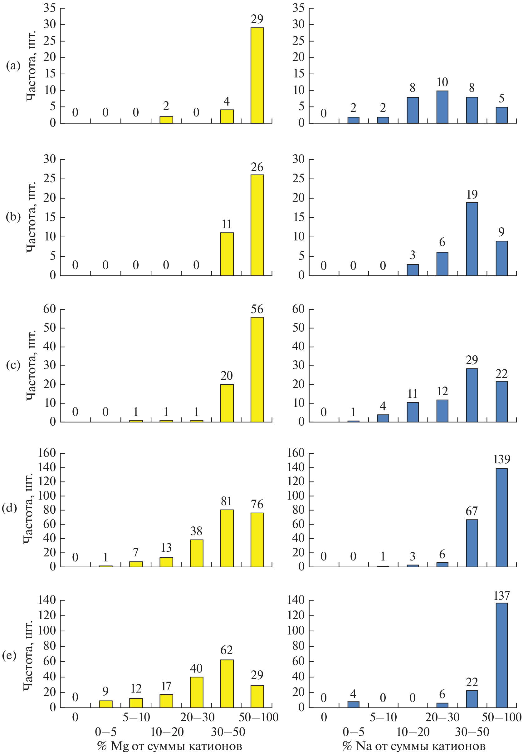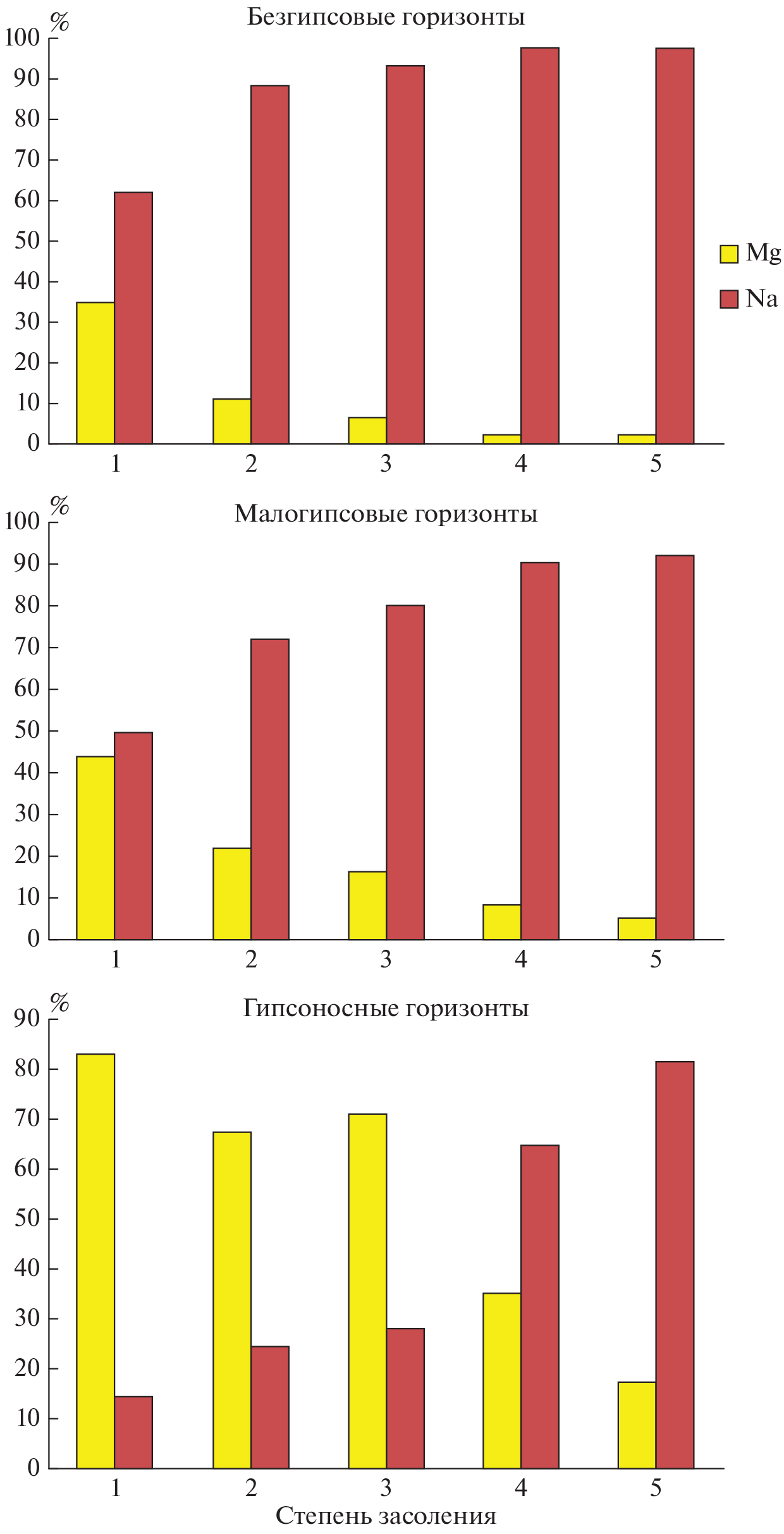Statistical analysis of 3802 samples of saline soils from different regions of Russia made possible to substantiate observations of a higher proportion of magnesium in soils containing gypsum compared to saline soils without gypsum. Gypsum is not a toxic salt and its presence does not lead to an increase in salinity. The increase of the salinity degree is mainly associated with sodium and magnesium salts, with the proportion of sodium more often than the proportion of magnesium. The article statistically substantiates that in the studied saline soils that do not contain gypsum, among the cations in the water extract (1 : 5), sodium most often dominates at any degree of salinity. The appearance of gypsum in the soil profile is accompanied by a significant increase in the proportion of magnesium. With a low and medium degree of salinity in horizons containing more than 1% gypsum, according to the median, as well as the arithmetic mean, upper quartile and maximum, the proportion of magnesium from the sum of sodium and magnesium in the water extract (1 : 5) is often more than 50%. Even at a strong and very strong degree of salinity, the proportion of magnesium in gypsum-containing horizons is significant and amounts to 43 and 31%, respectively, on the median, which is 5.8–6.7 times higher than the proportion of magnesium in gypsum-free horizons of the same degree of salinity.
