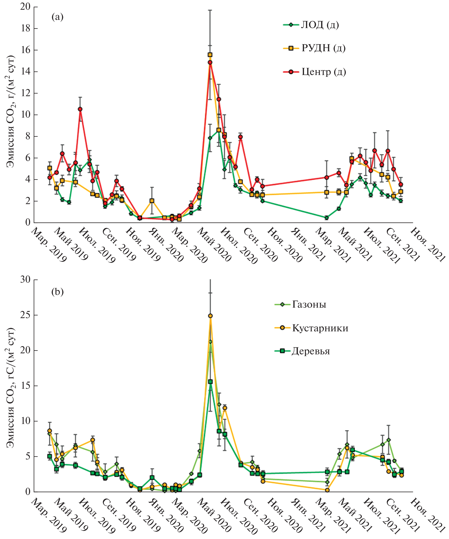 - Hill A.C., Barba J., Hom J., Vargas R. Patterns and drivers of multi-annual CO2 emissions within a temperate suburban neighborhood // Biogeochemistry. 2021. V. 152. P. 35–50.