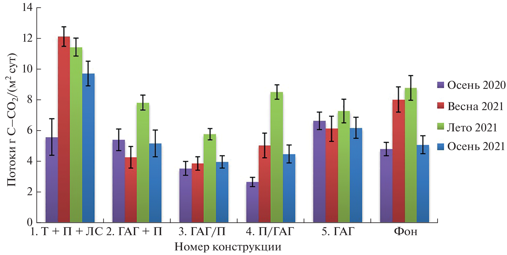 Сonstructed Technosols are an important component of urban green infrastructure whose role in the carbon balance of urban ecosystems remains poorly understood. The dynamics of carbon stocks and CO2 emissions of soil structures depend on both bioclimatic conditions and the parameters of the construction – the substrates used, the composition and thickness of the layers. The carbon stock dynamics and CO2 emission were studied on constructozems of different composition established at the “Experimental Station for Study of Soil Constructs” in the Botanical Garden of the Southern Federal University (Rostov-on-Don). The station consists of 15 self-contained sites, which present 5 different variants of soil constructions created using substrates traditionally used for landscaping and beautification tasks in the cities of the steppe zone. The Haplic Chernozems, located on a placor plot in the vicinity of the Experimental Station, was studied as a background area. Monitoring studies over two seasons (from September 2020 to December 2022) allowed the seasonal dynamics of organic and inorganic carbon content and CO2 emissions to be compared for the different soil design options in comparison with the background. In all constructions created on the basis of humus-accumulative horizons of chernozems, a marked dependence of CO2 emission on air (at p < 0.05 for construction 2 r = 0.76, construction 3 – r = 0.82, construction 4 – r = 0.76, construction 5 – r = 0.49) and soil (at p < 0.05 for construction 2 r = 0.58, construction 3 – r = 0.74, construction 4 – r = 0.75, construction 5 – r = 0.68) and soil (at p < 0.05 for construction 2 r = 0.58, construction 3 – r = 0.74, construction 4 – r = 0.75, construction 5 – r = 0.68) was noted. The biomass stocks of lawn grasses growing on the constructions were determined, and a positive correlation between the CO2 emission and the growth of the above–ground biomass (for construction 2 a moderate correlation (r = 0.48, p < 0.05), for constructions 3 and 4 a marked correlation (r = 0.5, p < 0.05; r = 0.68, p < 0.05), and for construction 5 a high correlation (r = 0.75, p < 0.05) was noted. The dynamics of the stock of various forms of carbon in the first year of operation of the structures were studied. Based on the comparison of carbon fluxes and stocks, it is shown that lawn ecosystems in the early stages of constructozem cannot be considered as net carbon stock sites in the temperate continental climate of Rostov-on-Don.