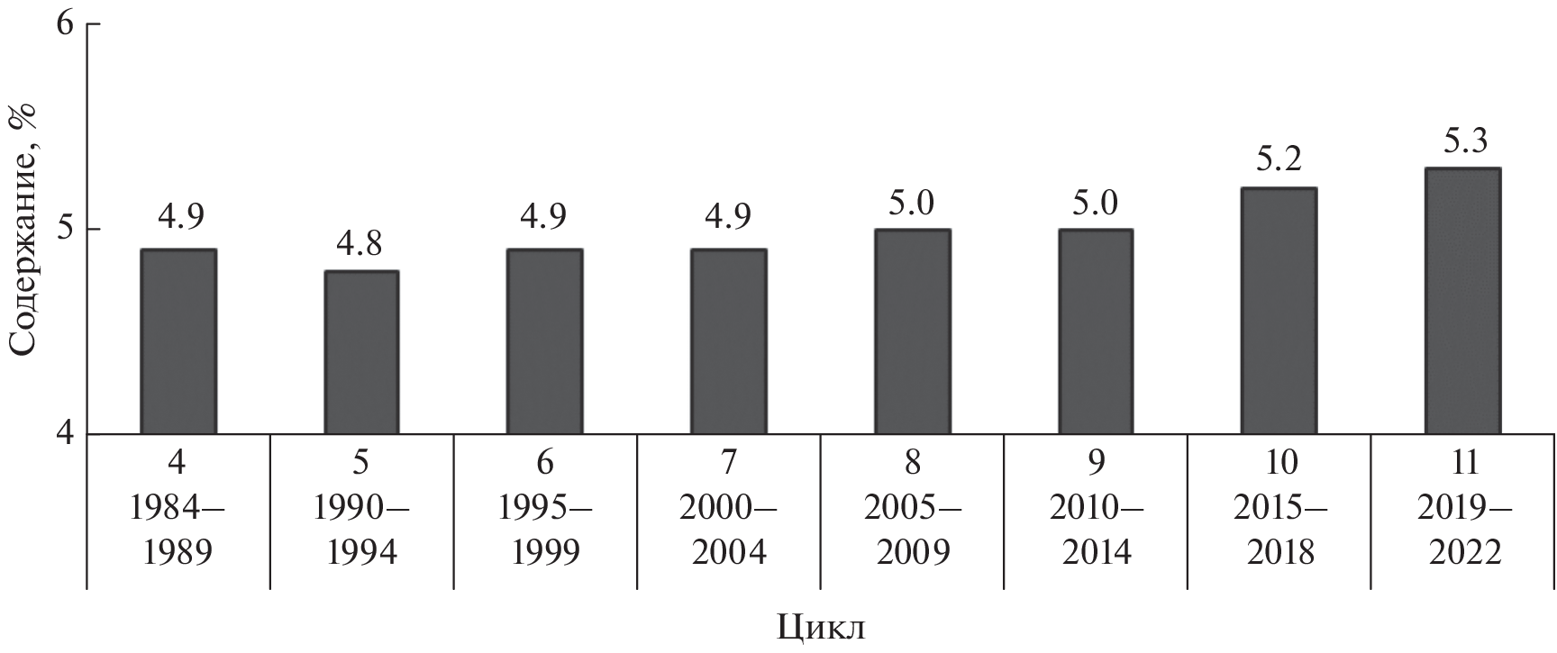 The paper analyzes the results of eleven survey cycles of arable soils conducted from 1964 to 2022 in the southwestern part of the Central Chernozem region in the Belgorod region. In the steppe zone of the region, ordinary chernozems predominate, in the forest-steppe zone – typical and leached chernozems. During the eleventh survey cycle (2019–2022), the average level of application of mineral fertilizers was 114.4 kg a.i./ha, organic – 9.6 t/ha, liming of acidic soils – 43.8 thousand hectares per year. As a result, the average yield of winter wheat increased to 5.09, sugar beet – up to 45.6, corn for grain – up to 7.15 t/ha. At the same time, the maximum value of the weighted average content of organic matter (5.3%) was recorded in the soils of arable land for the entire observation period. The proportion of acidic soils decreased to 28.6%, including moderately acidic soils, to 3.0%. The value of hydrolytic acidity decreased to 2.7 cmolc/kg. The weighted average content of mobile forms of phosphorus (139 mg/kg) and potassium (161 mg/kg) is the highest in the Central Black Earth region. 85.7% of the surveyed soils belong to the category of low content of mobile forms of sulfur, zinc – 97.2, copper – 92.5, cobalt – 98.8, manganese – 40.1, molybdenum – 21.3%. In terms of the content of mobile forms of boron, 98.2% of the soils are classified as highly rich.
