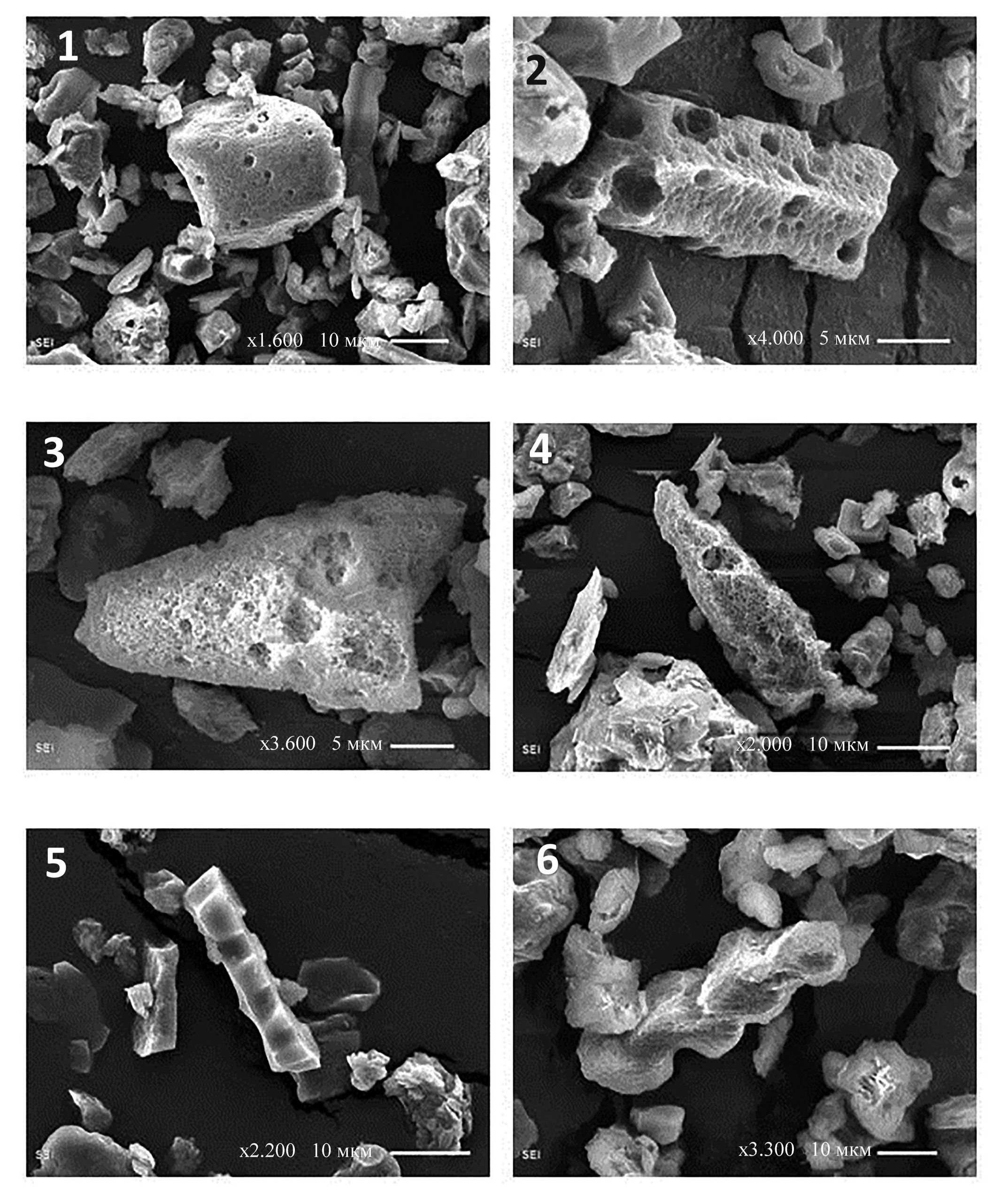 Рис. 3. Фитолиты в разрезе 7/11, глубина 120 см: 1 – тростник; 2 – хвойное; 3, 4 – лесные злаки; 5, 6 – луговые злаки.