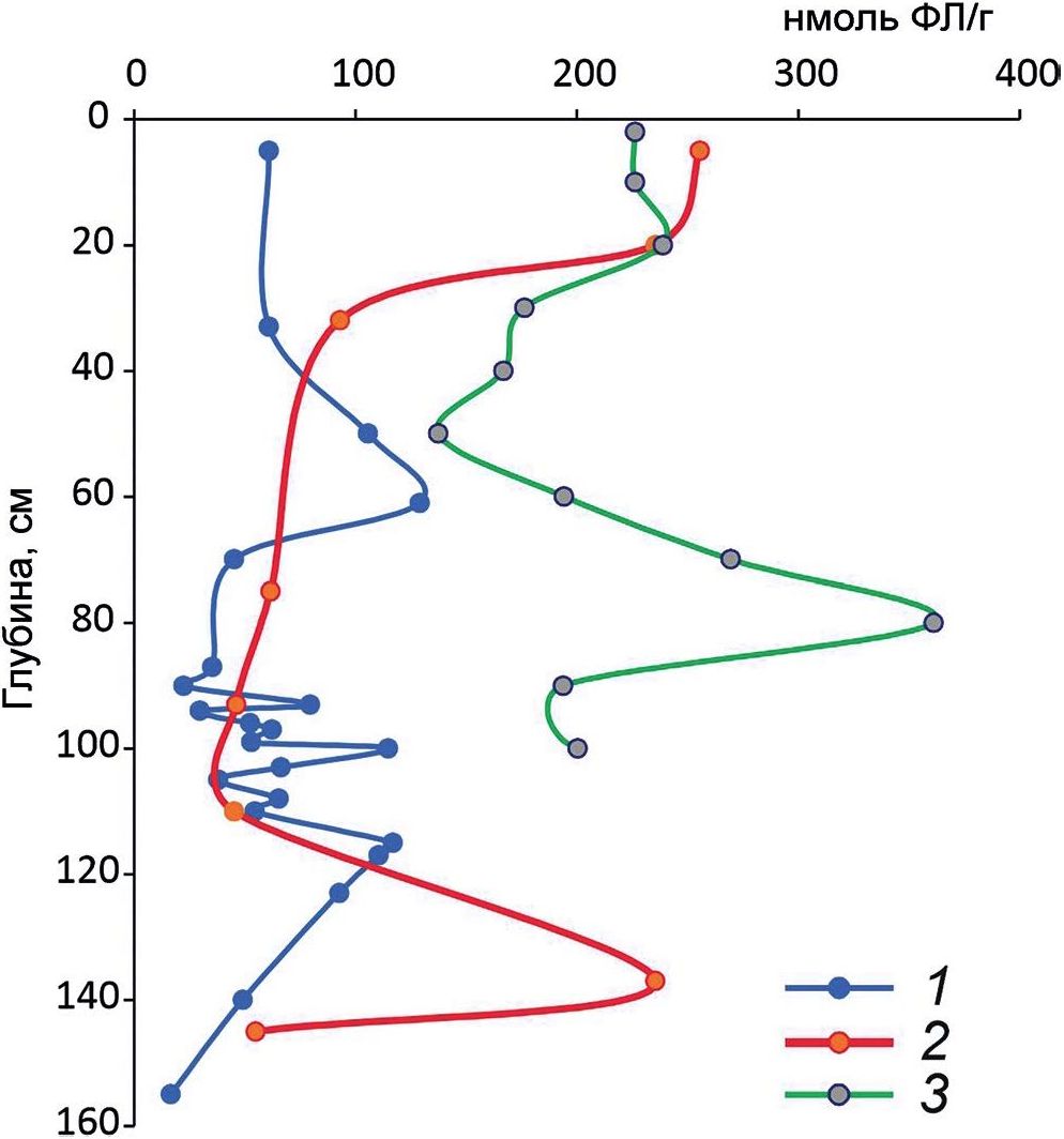 На рис. 8 хорошо видны характерные пики увеличения микробной биомассы в культурных слоях; при этом глубина залегания культурного слоя и характер перекрывающих отложений не играет существенной роли.