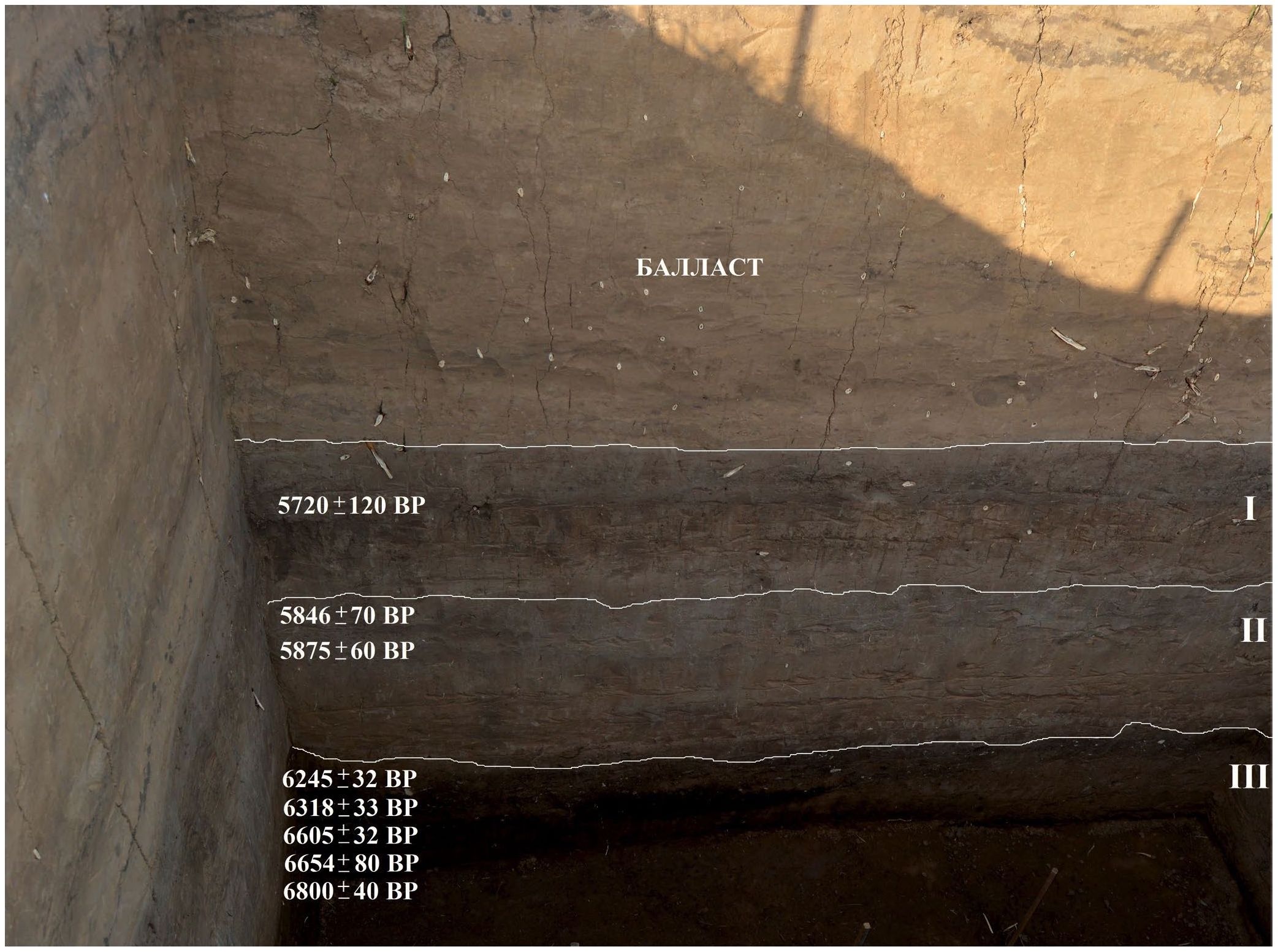 Данные радиоуглеродного датирования показали, что все выявленные разновременные КС были сформированы в голоцене, имеют следующий некалиброванный радиоуглеродный возраст (в скобках приведен калиброванный возраст, обрабатывали в программе OxCal 4.4.3) и получены по костям животных, углю и нагару на стенках керамической посуды: 6800±40 ВР (Poz-65198; 1σ 5722–5662 calBC, 2σ 5741–5631 calBC); 6654±80 BP (SPb-1509; 1σ 5640–5510 calBC, 2σ 5710⁻⁵470 calBC); 6605±32 BP (AAR-21893; 1σ 5565–5510 calBC, 2σ 5620–5480 calBC); 6318±33 BP (AAR-21892; 1σ 5330–5280 calBC, 2σ 5360–5210 calBC); 6245±32 BP (AAR-21891; 1σ 5300–5210 calBC, 2σ 5310⁻⁵200 calBC); 5875±60 ВР (SPb-1968; 1σ 4833–4687 calBC, 2σ 4856–4580 calBC); 5846±70 ВР (SPb-3116; 1σ 4792–4614 calBC, 2σ 4851–4534 calBC); 5720±120 ВР (SPb-1475; 1σ 4710⁻⁴450 calBC, 2σ 4840–4340 calBC) [20].