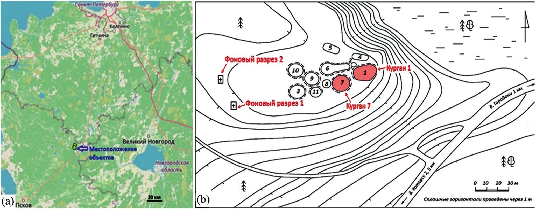 Курганная группа Которск XII расположена на вершине камового холма под сосняком зеленомошным (рис. 1b). Курганы представляют собой куполообразные сооружения высотой 1.5–2.0 м с выположенной вершиной. Согласно археологической классификации, объекты относятся к культуре “длинных курганов” [17]. Данная культура является частью псковско-новгородской группы Приильменья. Памятники представлены различными видами погребальных сооружений, преимущественно куполообразными и валообразными по форме курганами. Топографически могильники приурочены к сосновым лесам [17, 21].