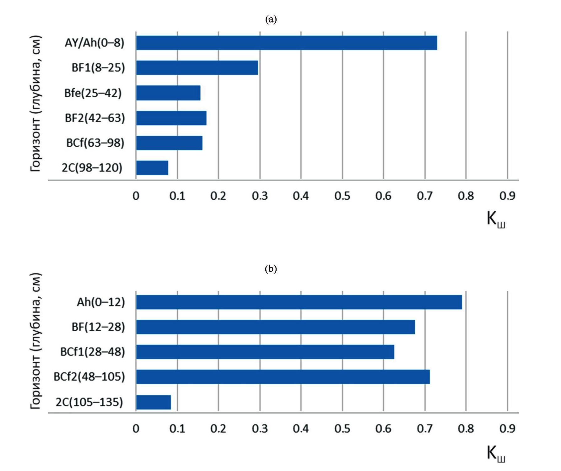 Рис. 4. Значения коэффициента Швертмана в погребенных почвах курганов 1 (a) и 7 (b).