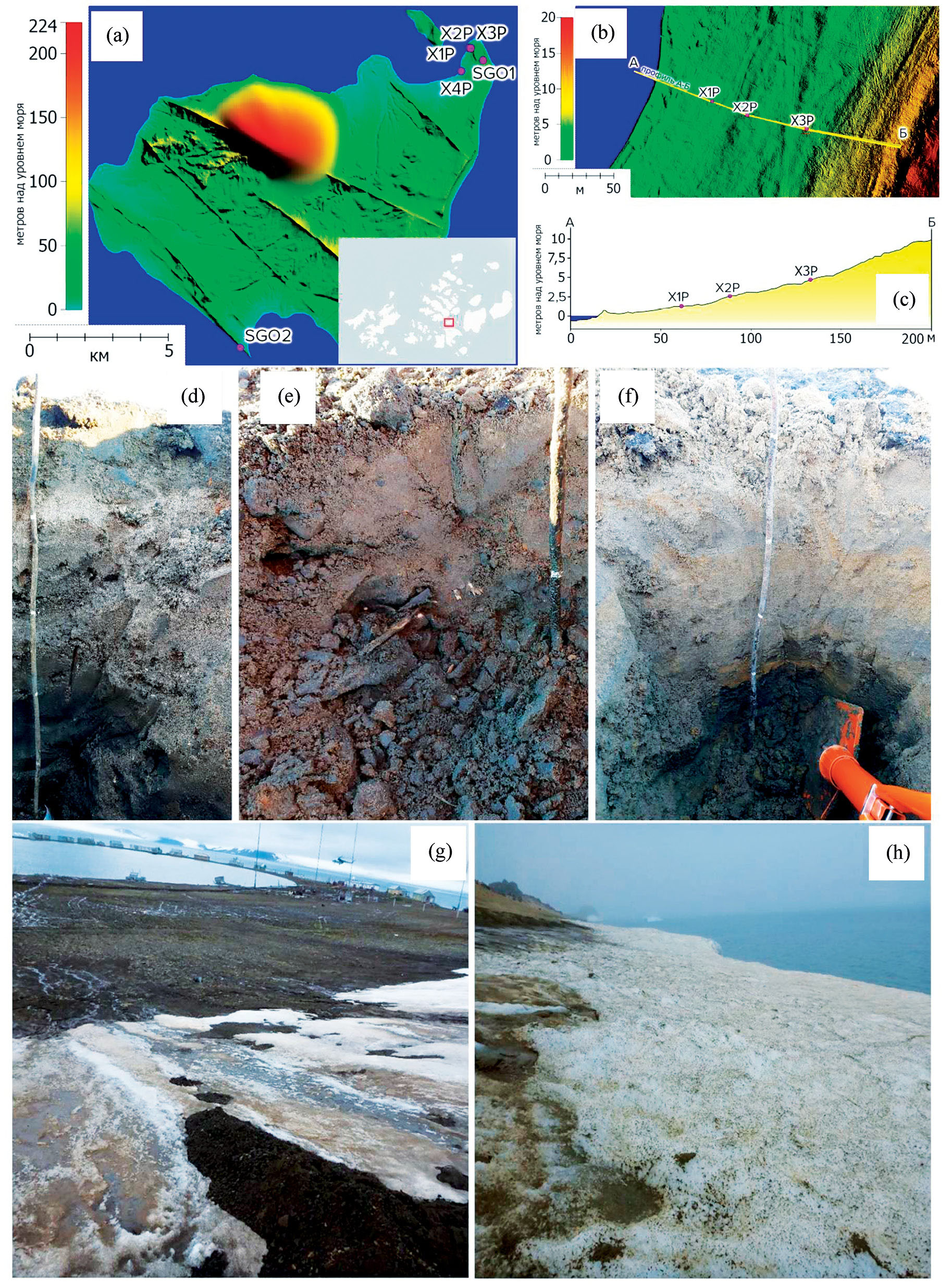 Рис. 1. Объекты исследования: a – карта-схема объектов исследования, рельеф на основе ArcticDEM [41]; b – карта-схема расположения X1P, X2P, X3P на основе фрагмента ЦММ с профилем А–B; c – высотный профиль А–B. Профили почв: d – X2P (псаммозем мерзлотный глееватый); e – X3P (псаммозем мерзлотный глееватый); f – X4P (псаммозем сильнощебнистый); супрагляциальные объекты исследования: g – в районе метеостанции; h – в районе м. Останцовый.