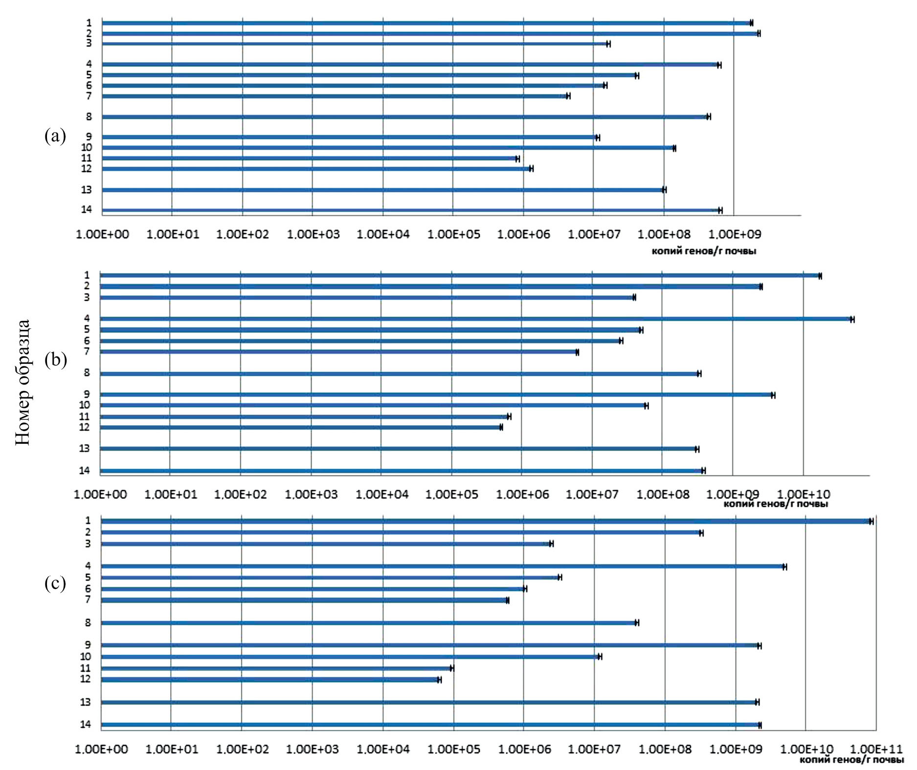 Рис. 2. Количество копий генов микроорганизмов: a – 16S рРНК архей; b – 16S рРНК бактерий; c – ITS рРНК грибов.