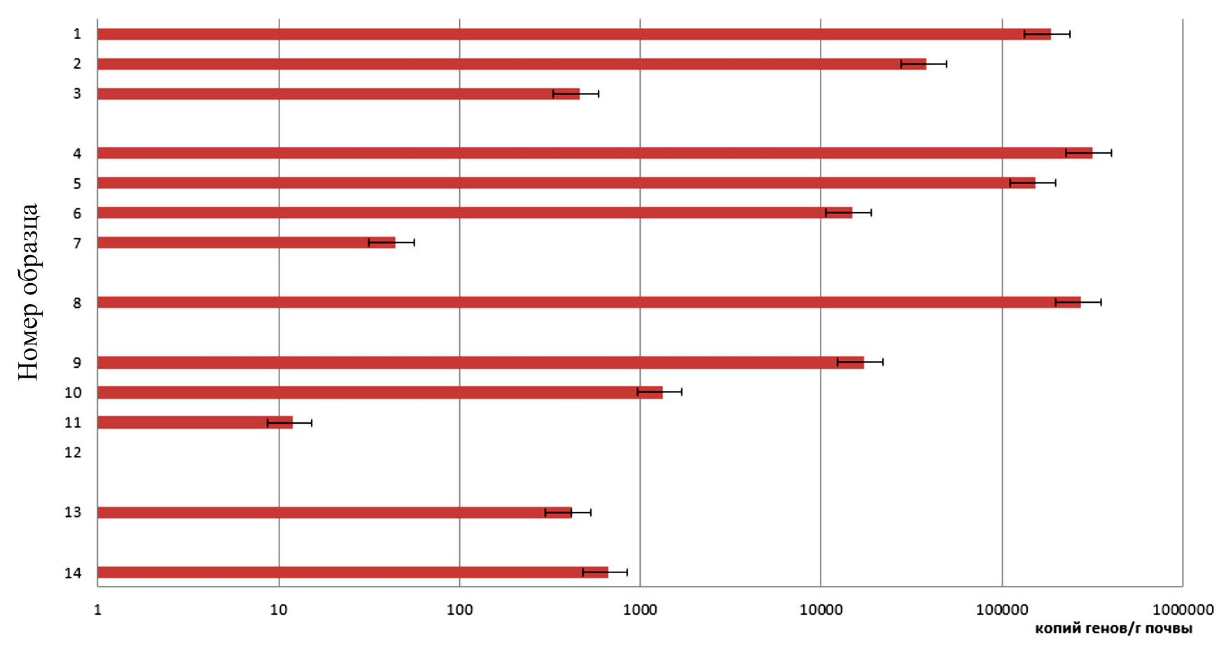 Численность копий функционального гена alkB в исследованных почвах сравнима со значениями, полученными исследователями ранее. Так, в образцах дерново-подзолистых почв, загрязненных полициклическими ароматическими углеводородами, отобранных на территории угледобывающего завода (осуществляющего свою деятельность в отрасли химической и нефтеперерабатывающей промышленности), значения концентрации гена алкан-монооксигеназы, определенные с помощью метода RT-PCR, составляли от 2500 до 3100 копий/г почвы, в то время как для фоновых территорий этих почв величины были на порядок ниже и колебались в пределах от 35 до 830 копий/г почвы [44].