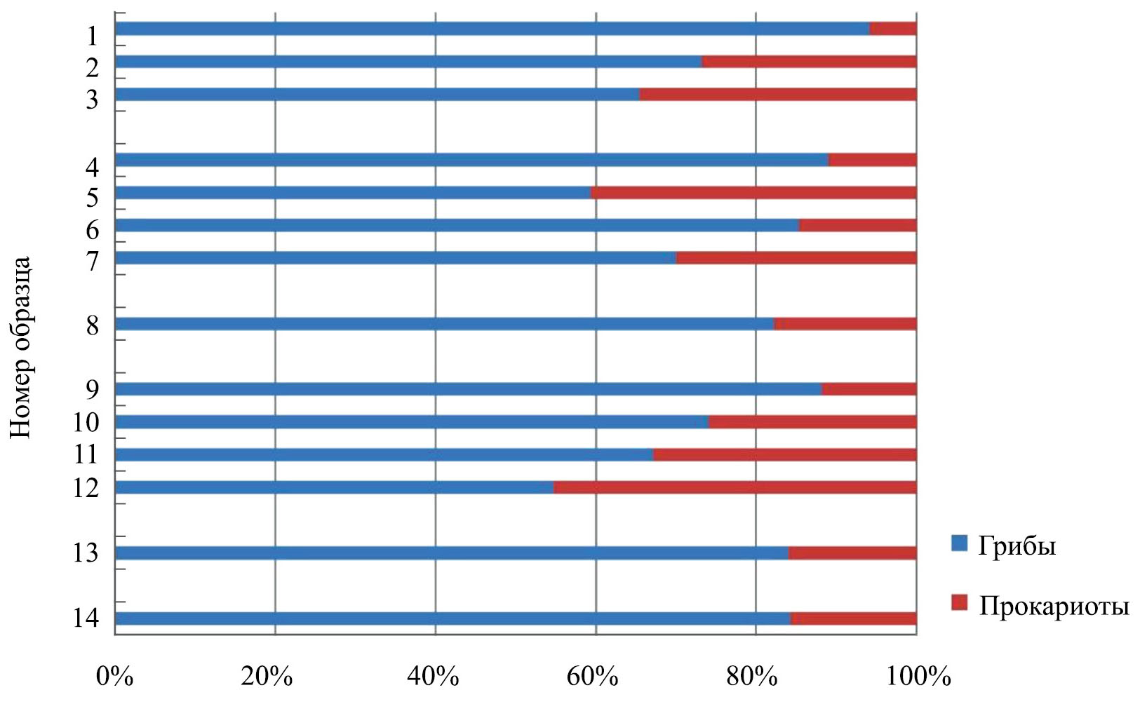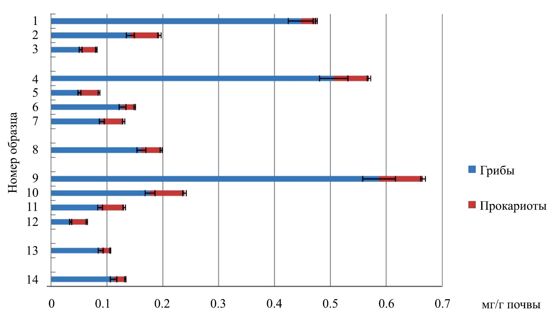 Сравнение распределения биомассы микобиоты и численности копий рибосомальных генов ITS рРНК грибов по изученным почвенным профилям во многом дает противоречивые результаты. В отдельных горизонтах, где грибная биомасса велика, низка численность генов, и наоборот. Полагаем, полученные данные по количественной ПЦР для грибов связаны с неравномерным распределением генетической информации в клетках микобиоты, которые могут содержать как по одному, так и по несколько ядер c различной концентрацией ДНК [36]. Кроме того, значительная часть рРНК грибов может находиться непосредственно в почве, а не клетках [29].