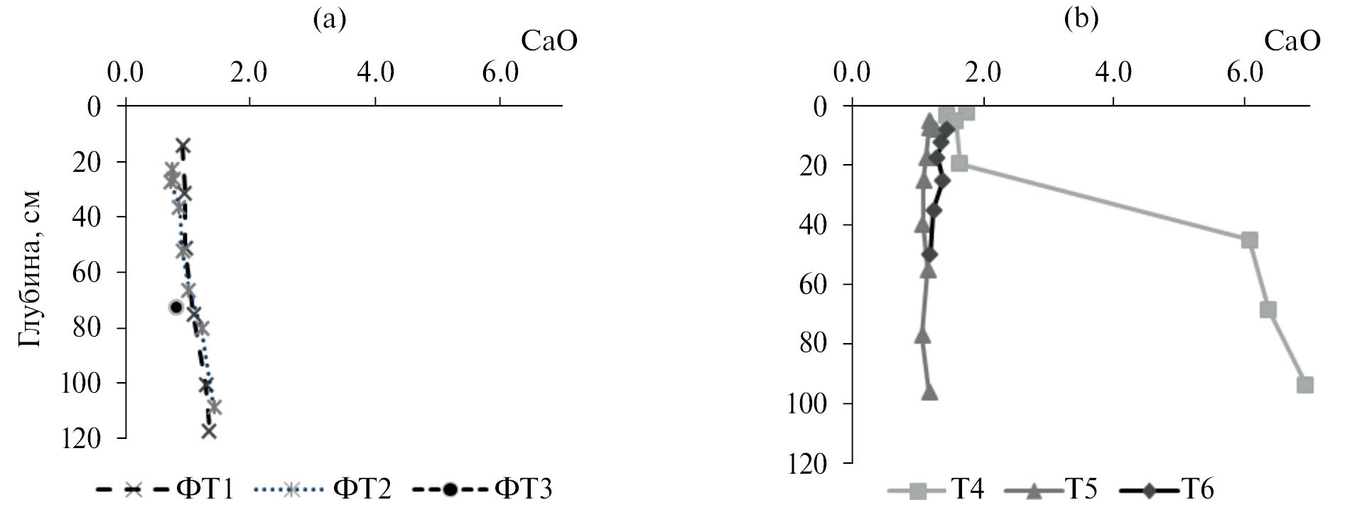 На участке Т6, для которого характерно застойное переувлажнение, в верхней части профиля формируется оторфованный иловато-перегнойный (Тmr) горизонт мощностью до 10–14 см. Ниже расположен пропитанный потечным гумусом горизонт С═g,hi, переходящий в бурый С═g с сизыми и ржавыми пятнами, подстилаемый насыщенным водой глеевым сизым горизонтом СG. В таких условиях ведущим процессом почвообразования становится торфонакопление. Анализ литературы [9, 24] показал, что скорость торфонакопления может достигать 1–3 мм/год. Сизые тона окраски минеральной толщи исследователи отмечают в переувлажненных почвах антропогенно трансформированных ландшафтов [44].