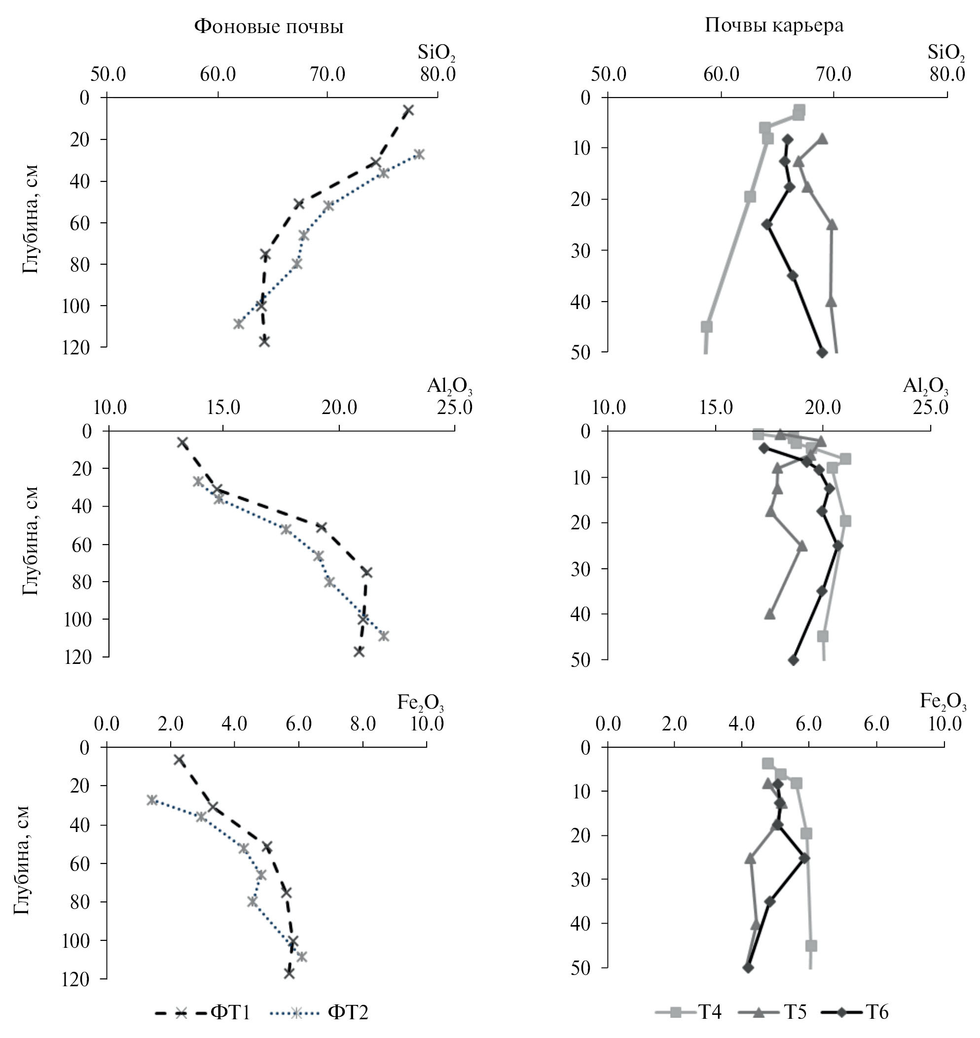 Гранулометрический состав почв. Почвы фоновых участков (ФТ1 и ФТ2) сформированы на отложениях тяжело- и среднесуглинистого гранулометрического состава, участка ФТ3 – легкосуглинистого (табл. 5). Все фоновые почвы характеризуются преобладанием фракций крупной пыли, ила и мелкого песка. Для почв участков ФТ1 и ФТ2 характерно облегчение верхней минеральной части профиля. Распределение илистых частиц в обеих почвах носит четко выраженный элювиально-иллювиальный характер.