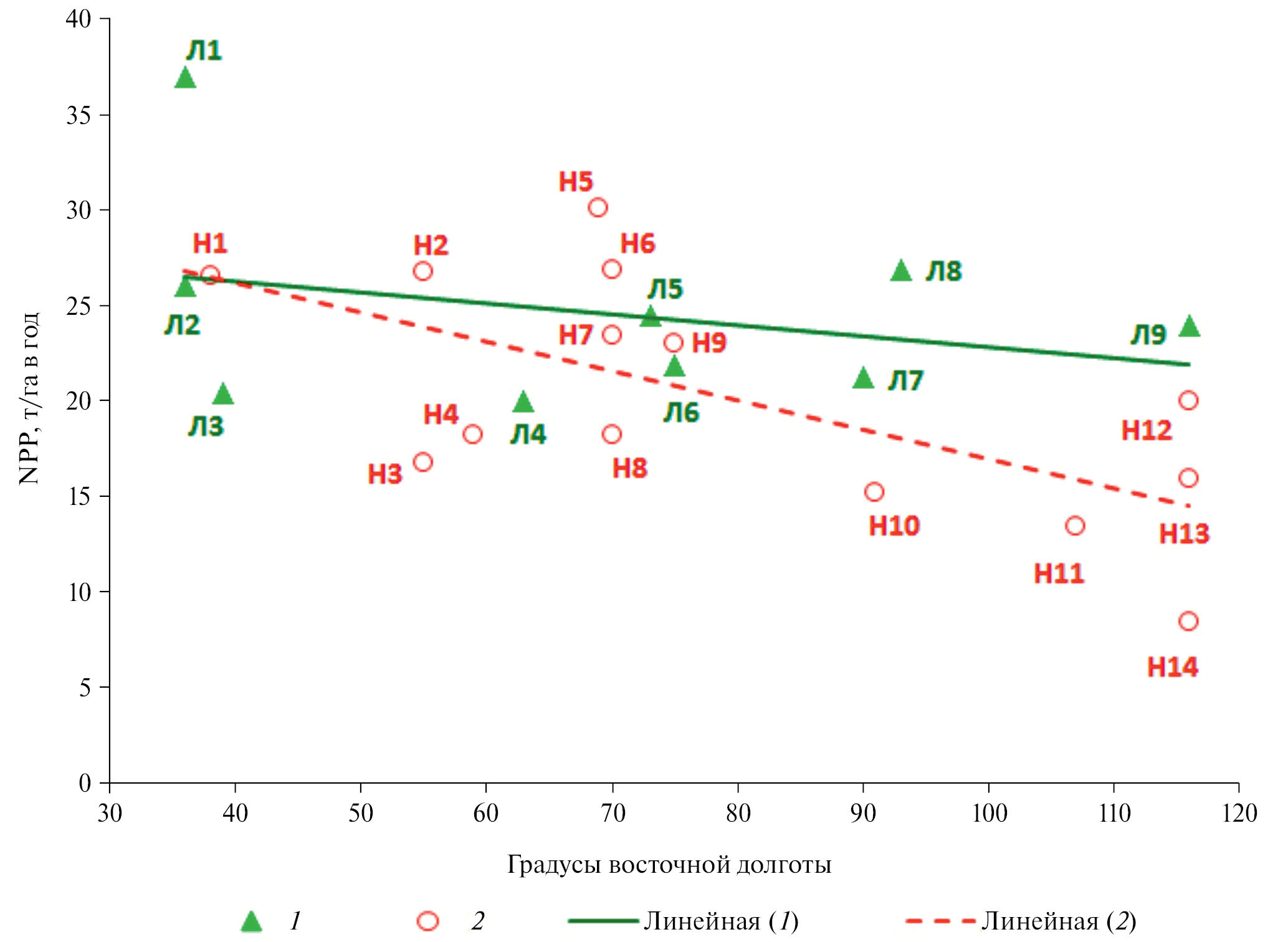 Рис. 1. Изменение чистой первичной продукции (NPP) луговых и настоящих степей по долготному градиенту: 1 – луговые степи (Л1–Л9), 2 – настоящие степи (Н1–Н14). Характеристика степей приведена в табл. 1.