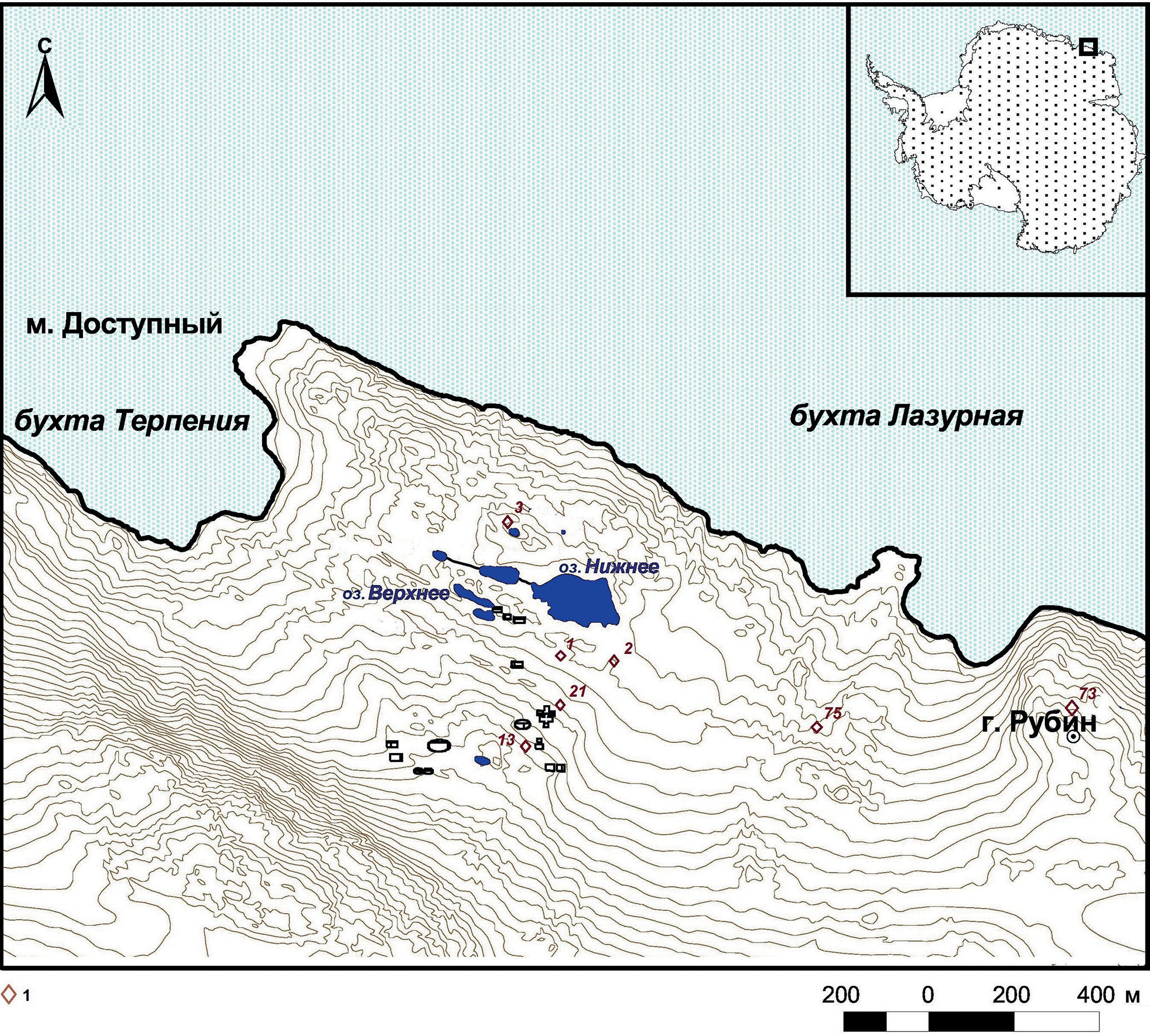 Рис. 1. Местоположение точек отбора проб почв в оазисе Вечерний, Земля Эндерби.