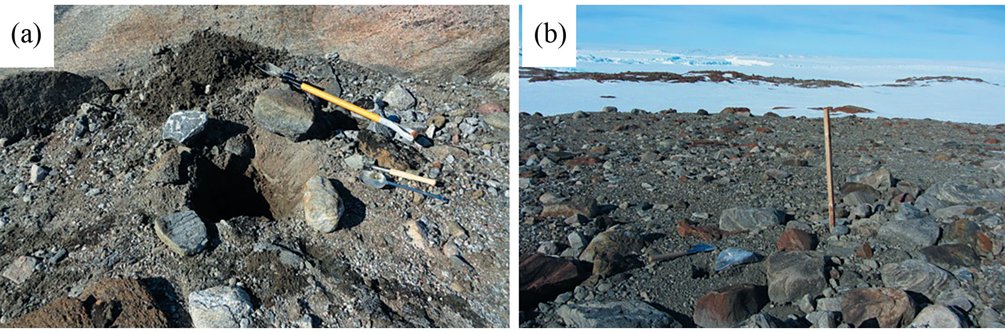 Почвообразующими породами являются продукты выветривания коренных пород, делювий, коллювий, флювиогляциальные и моренные отложения. Общий вид двух типичных участков отбора (на флювиогляциальных и моренных отложениях) приведен на рис. 2. Почвы слаборазвиты, верхние горизонты представлены щебнисто-гравийным, песчано-гравийным или каменисто-щебнистым материалом и по своим свойствам относятся к мерзлотным почвам (Cryosols). На долю мелкозема (фракции диаметром <1 мм) приходится, как правило, менее 50% массы пробы; для моренного участка их доля составляет 65.5%. Потери при прокаливании для указанных проб варьируют от 0.1 до 1.0%, что подтверждает полученные ранее данные о крайне низком содержании органического вещества в почвах оазиса [33]. Почвы преимущественно кислые, в районе моренных отложений – слабокислые.