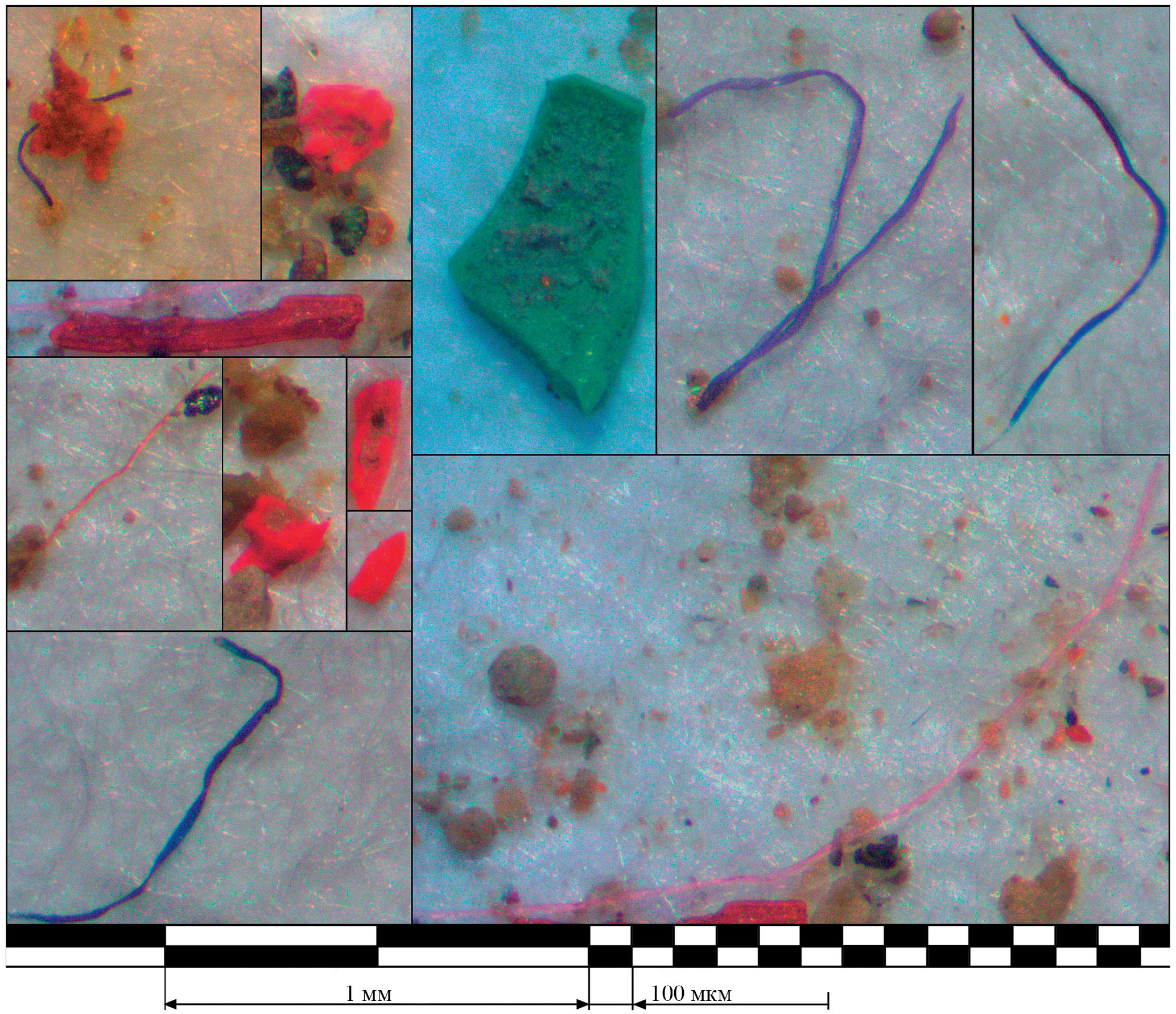 По цвету частицы микропластика разнообразны. При этом фрагменты неправильной формы чаще красного цвета, хотя имеются зеленые и белые. Среди волокон встречаются синие, фиолетовые, прозрачные, красные/розовые. На рис. 4 показаны фотографии выявленных различных частиц микропластика в одной из проб почв оазиса.