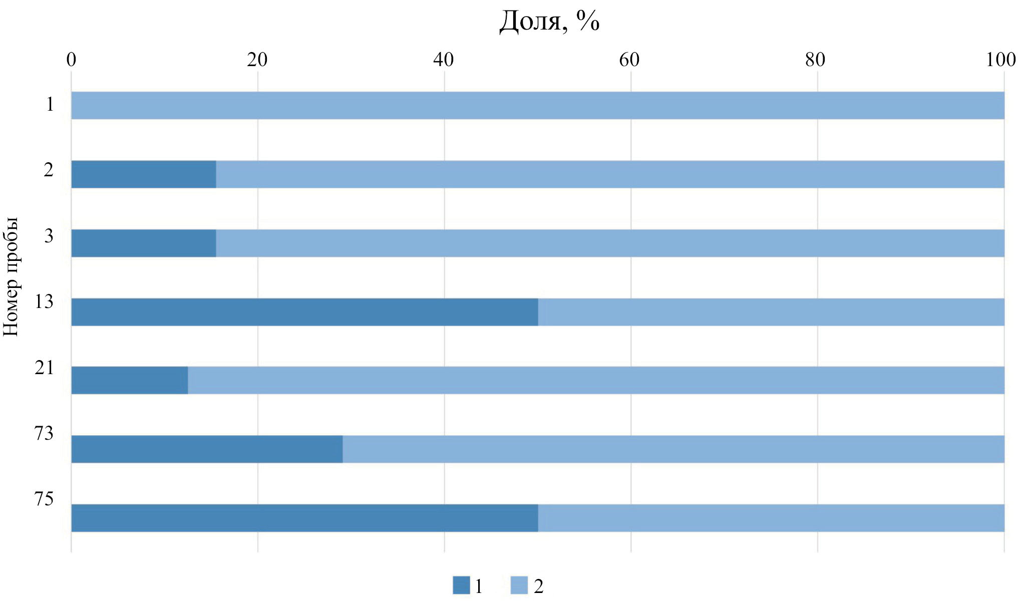 Рис. 6. Соотношение частиц микропластика в пробах почв оазиса Вечерний во фракциях размером: 1 – 1–5 мм, 2 – <1 мм.