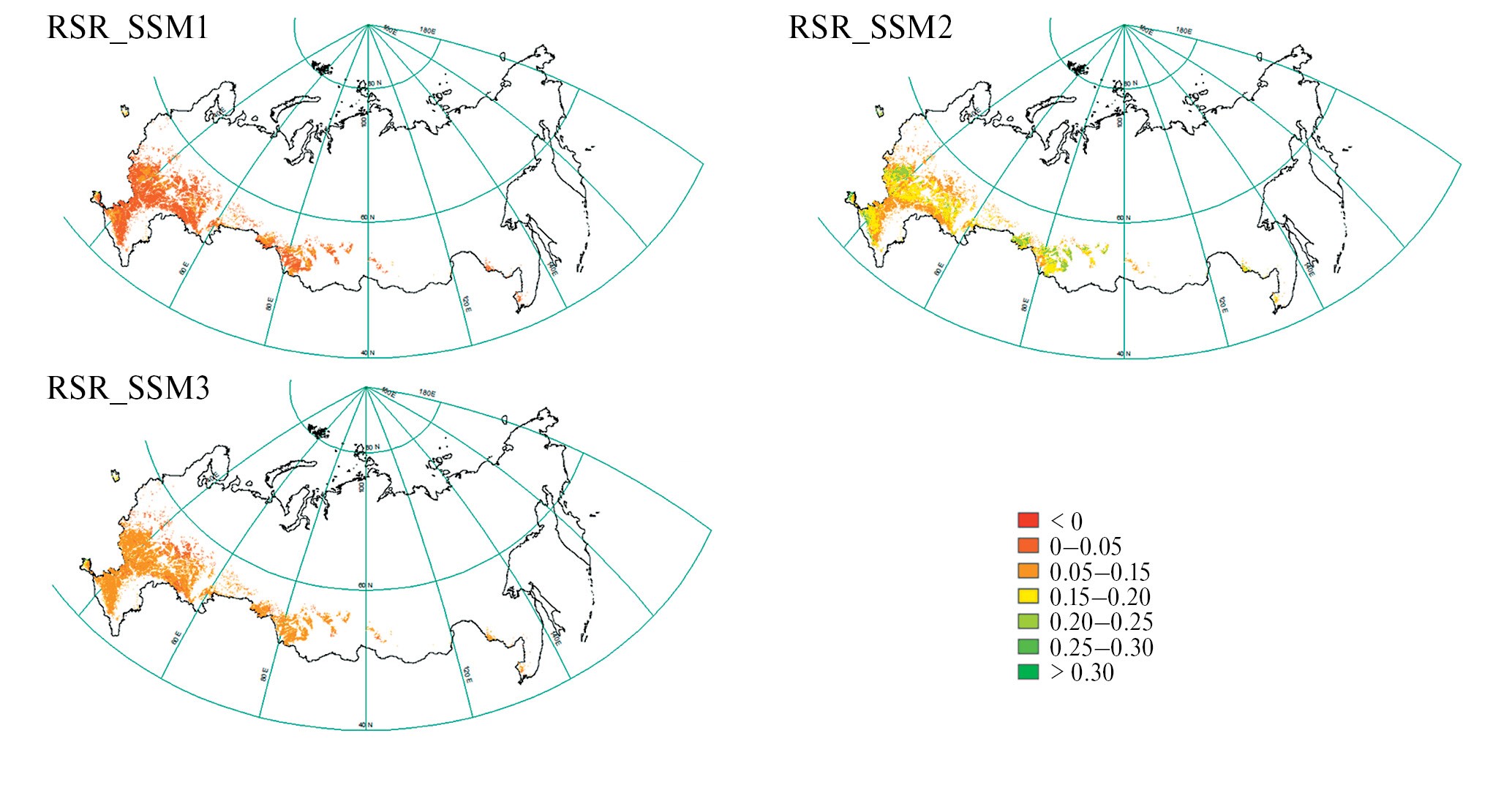 Далее были получены три карты относительной скорости секвестрации почвенного углерода (RSR) [27], как разница ASR за период в 2020–2040 гг. по сценарию SSM1,2,3 по сравнению с неизменным хозяйствованием (BAU).
