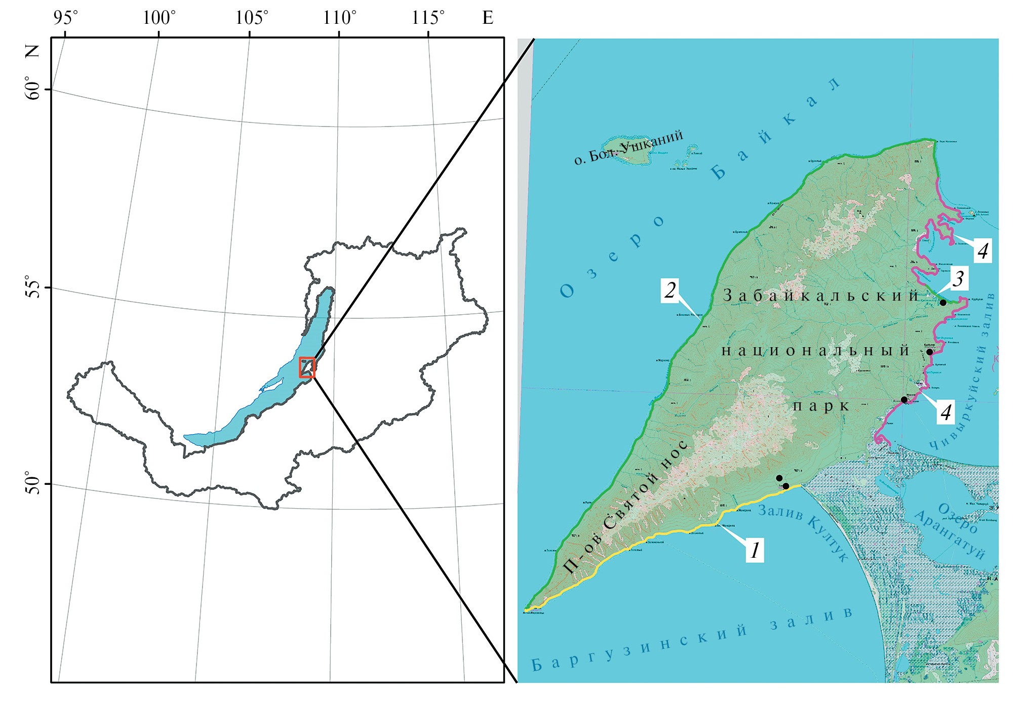Низкие абразионные с отчлененными лагунами берега. Здесь заложен ключевой участок Глинка, расположенный в 700 м от одноименного названия местности в заливе Култук Баргузинского залива. Высота над ур. м. – 548 м (91 м над уровнем Байкала1). Координаты: 53°36ʹ10.3ʺ N; 108°50ʹ29.3ʺ E. Территория представляет собой предгорную равнинную лесную полосу, сочлененную с аккумулятивным озерно-болотным перешейком полуострова. Ширина полосы составляет не более 3 км. Распространенные на участке душекиево-березово-лиственнично-сосновые леса вплотную подступают к литорали, без полосы приозерных лугов. В кустарничковом ярусе преобладают кедровый стланик Pinus pumila, рододендрон даурский Rhododendron dauricum, брусника Vaccinium vitis-idaea. Поверхность покрыта зелеными мхами и ягелем. Подобные прибрежные низкие полосы, находящиеся под непосредственным охлаждающим в летний период и увлажняющим воздействием Байкала, названы Тюлиной [32] подпоясом температурной инверсии, или ложноподгольцовым.