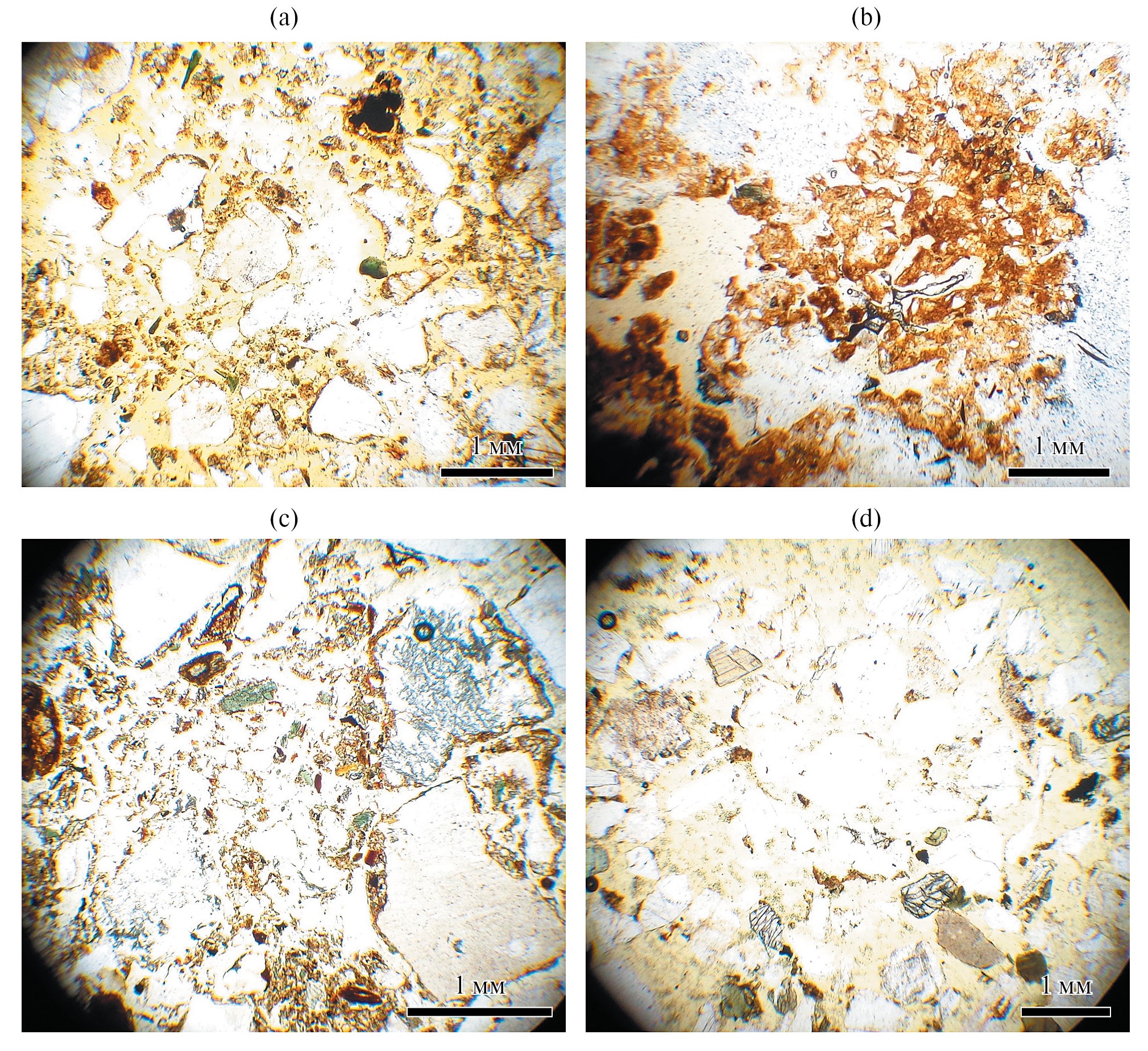 Рис. 2. Микроморфологическое строение почв: a – общее строение горизонта ВНF в подбуре оподзоленном (N II), b – глинистый плазменный материал в горизонтах ВМ буроземов (N II), c – глинисто-железистые пленки на поверхности минералов в горизонте Bf дерново-подбура (N II), d – рыхлая упаковка минерального скелета и обедненность плазменным материалом в горизонте Е дерново-подзола (N II).