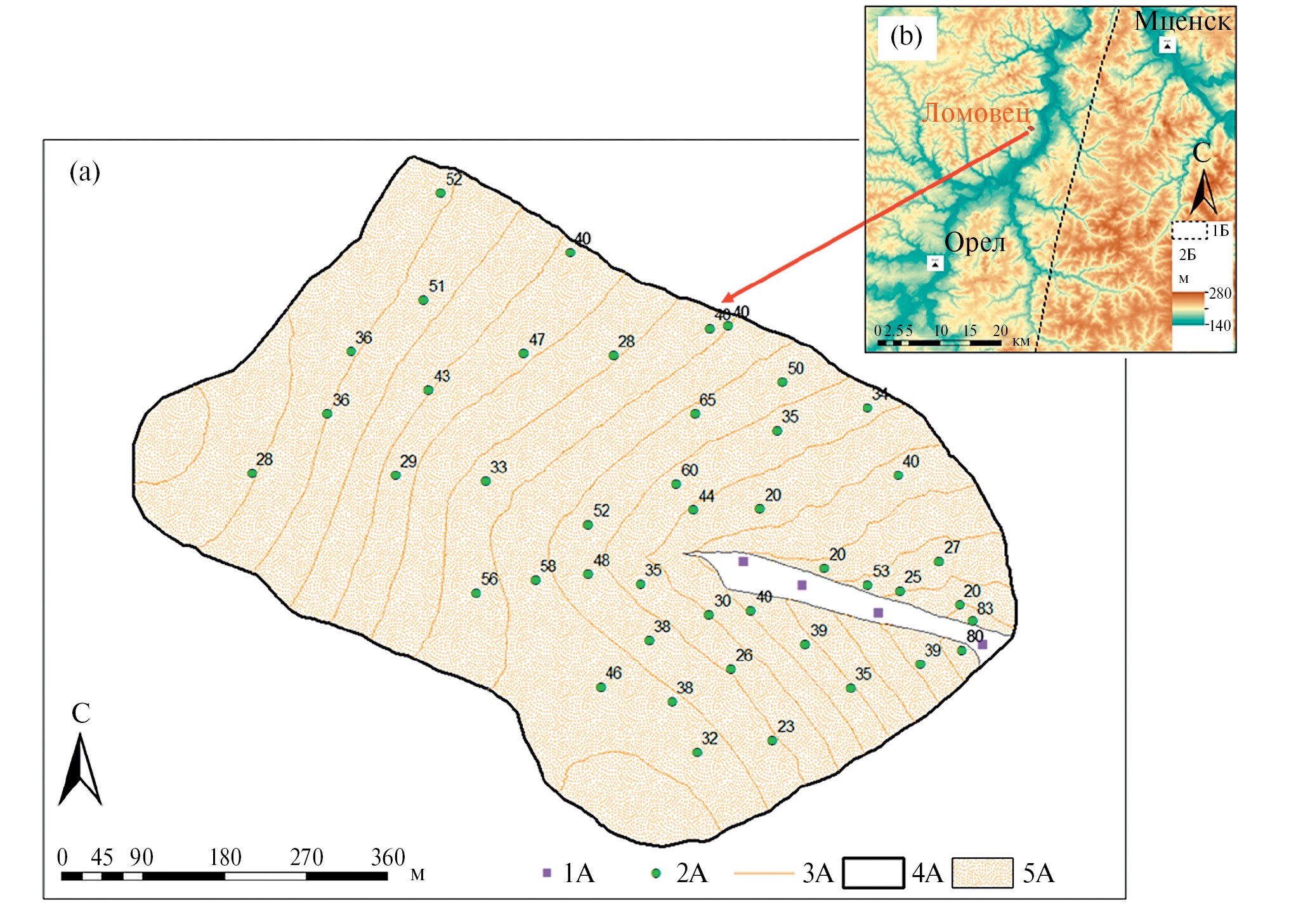 Рис 1. Водосбор Ломовец (a) и его расположение относительно рельефа и крупных городов с метеостанциями в Орловской области (b). 1А – почвенные разрезы и точки послойного отбора образцов в днище ложбины; 2А – точки бурения почв и отбора образцов из пахотных горизонтов, рядом показана установленная мощность горизонтов А+АВ; 3А – горизонтали с сечением 2 м; 4А – граница водосбора; 5А – распахиваемая часть водосбора; 1Б – граница между лесной и лесостепной областями Русской равнины согласно [16]; 2Б – абсолютная высота, м.